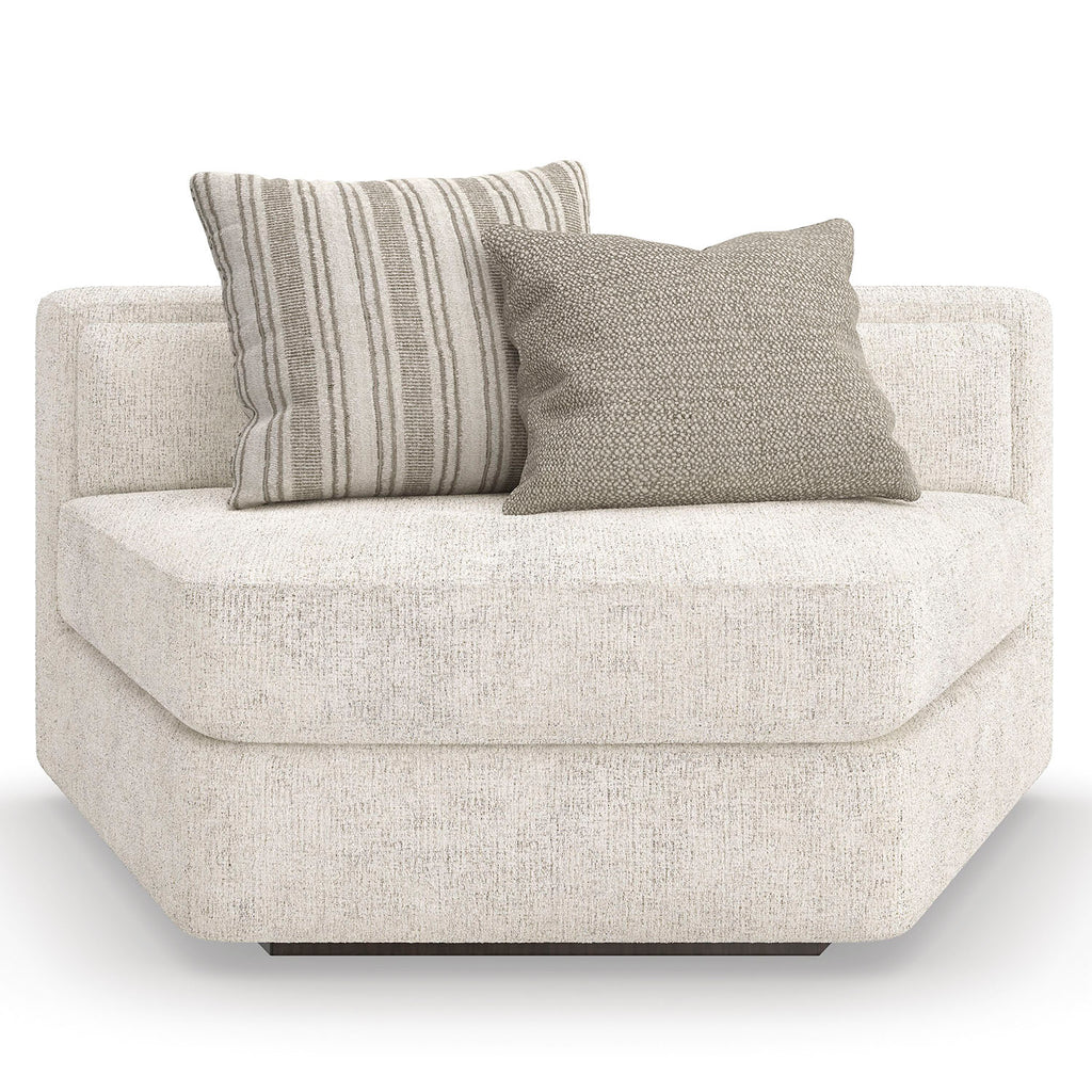 A holistic expression of design integrity, the Caracole Unity sectional mixes singular elements: organic tones, contrast, and texture to create a sense of harmony. Clean lines call to mind a modern European style, dressed in a creamy tactile fabric with a contrasting leather panel outback. Introduces a low, lounge-like aesthetic with lumbar cushioning along the back and feather-down toss pillows for added comfort and layering.