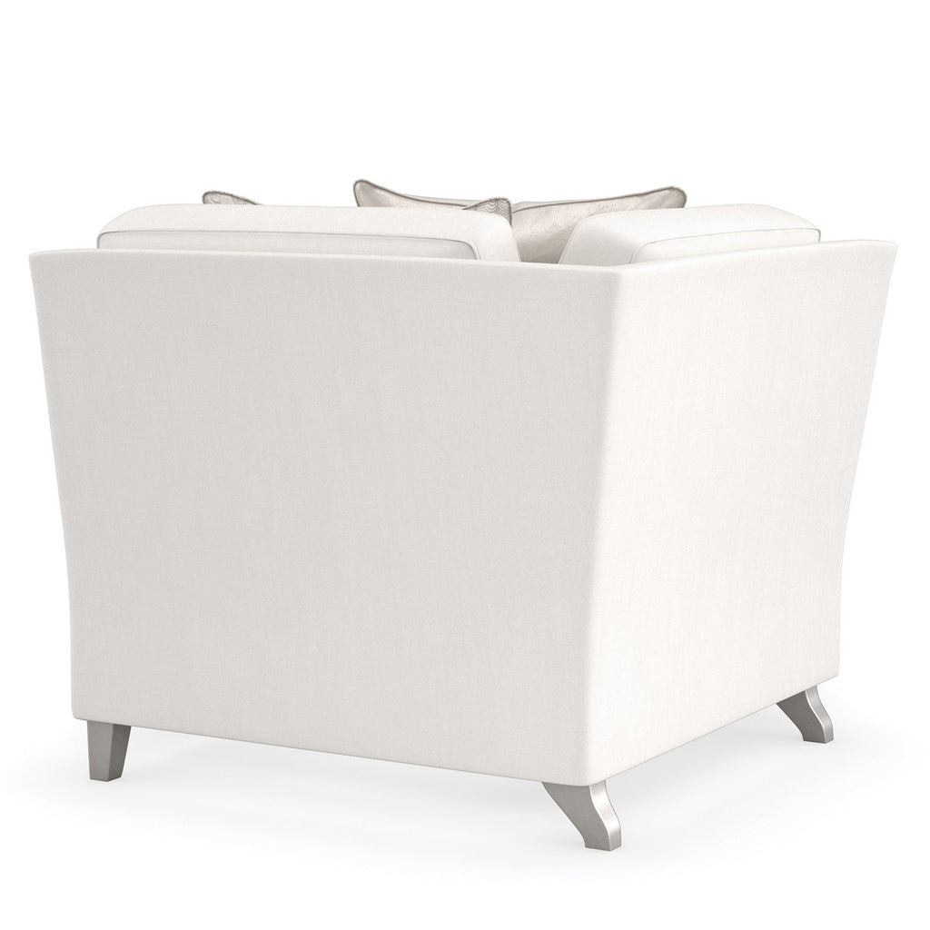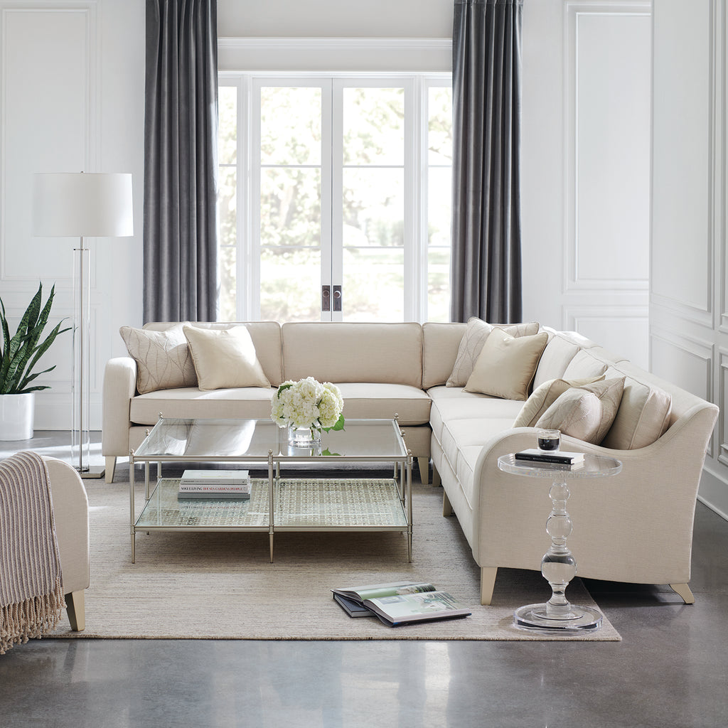 Inspire sparkling conversation and moments of reflection with this shapely sectional, upholstered in a cream performance basketweave with a subtle luster. A fresh, yet familiar addition to living room interiors, its gently sloping arms lend a contemporary take on the classic English arm, complemented by tapered legs in a Sparkling Argent finish. Accent pillows add shimmer and tactile appeal in a botanical leaf print and gold-toned satin. Sofa and chair also available.