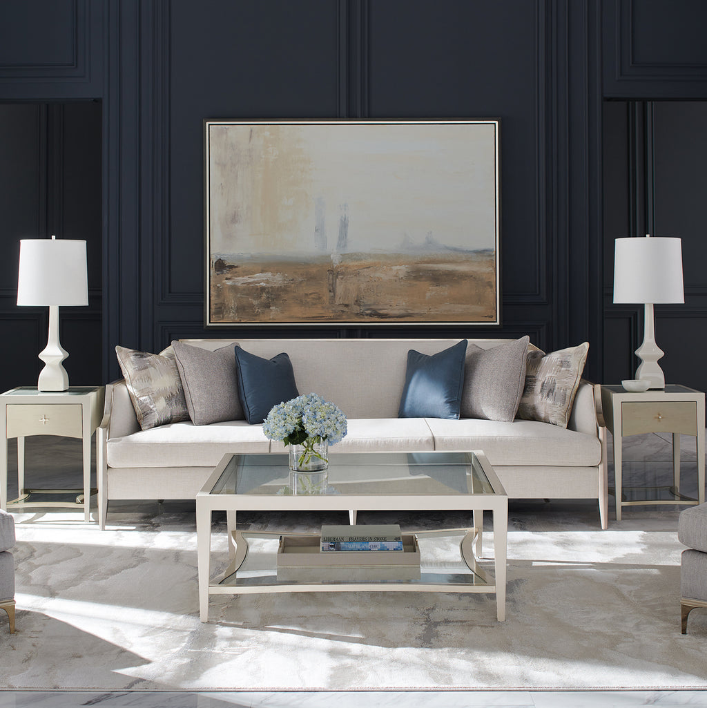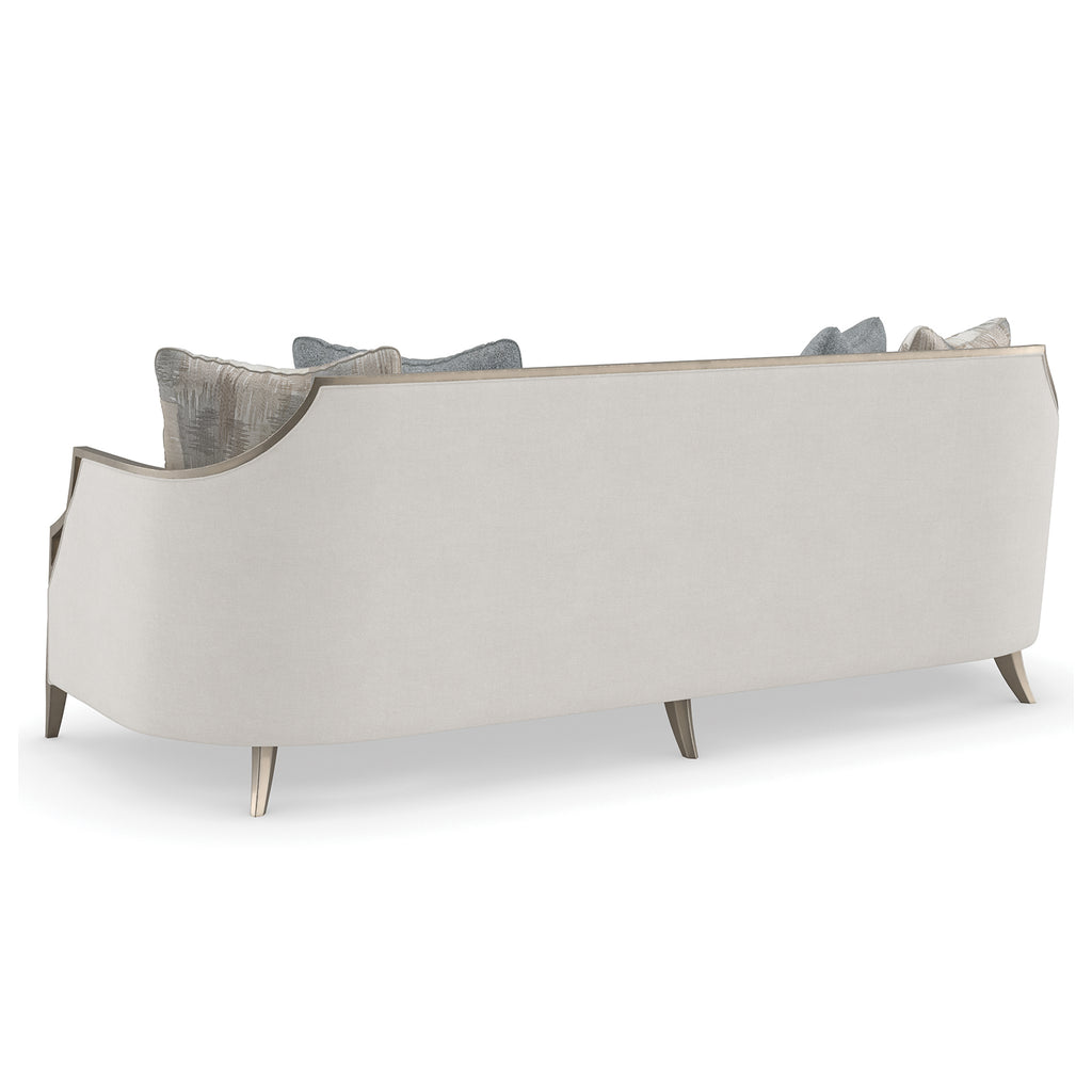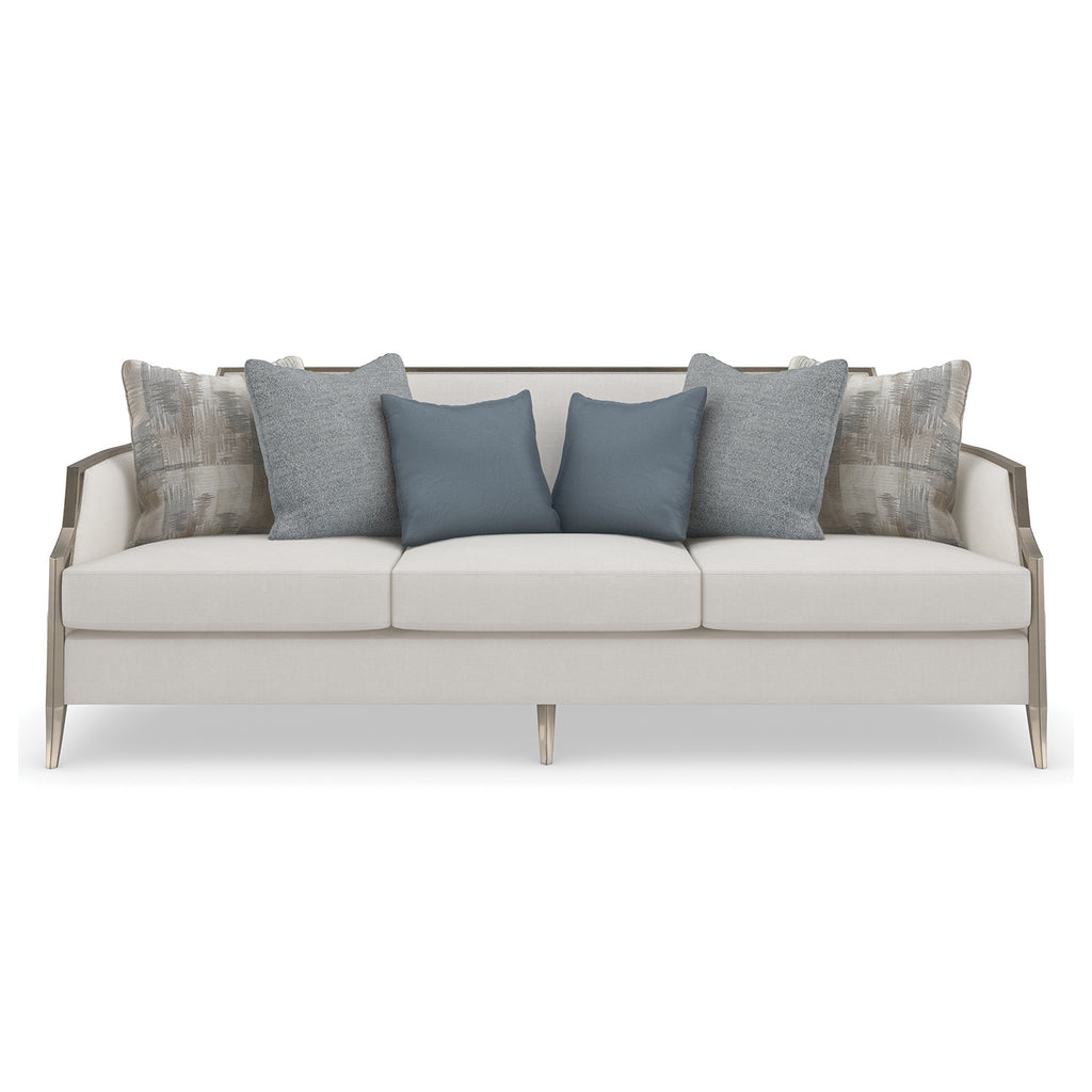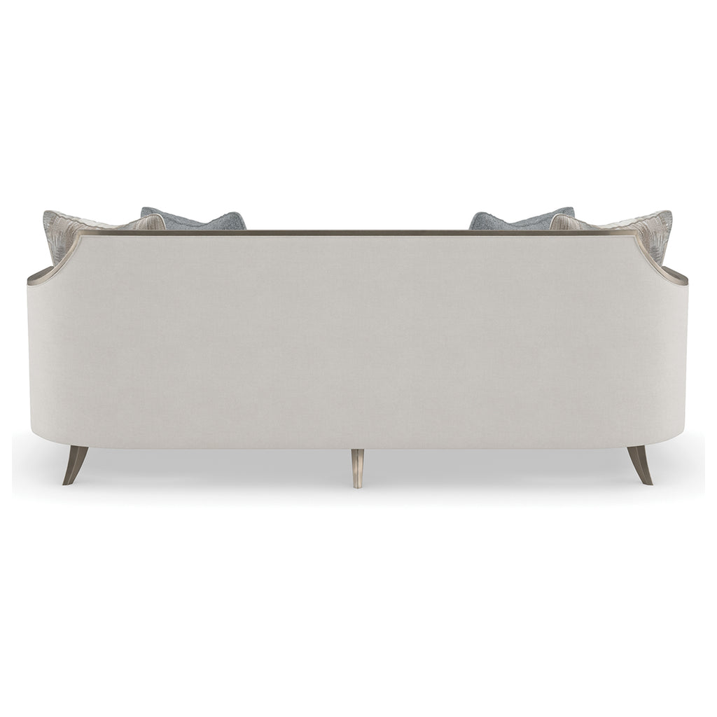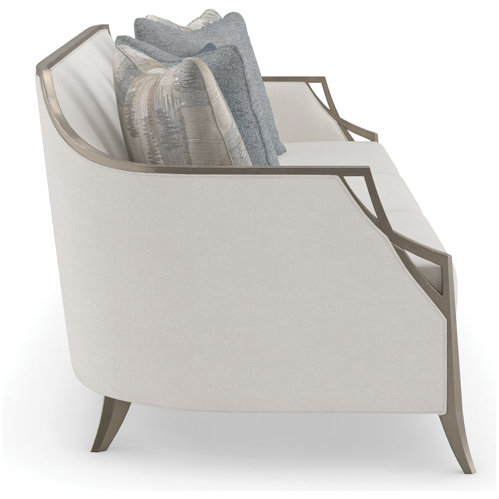 Make an elegant statement with this unforgettable sofa, eloquently mixing classic and contemporary design details. A metallic Charcoal Leaf finish accentuates its wood-trimmed silhouette, made modern with a carved crisscross pattern that draws the eye to gently sloping arms and splayed legs. Dressed in a fashionable herringbone performance fabric with a luxuriously soft hand, and feather-down toss pillows in a calming palette of blue and silver hues. Matching X factor chair also available.