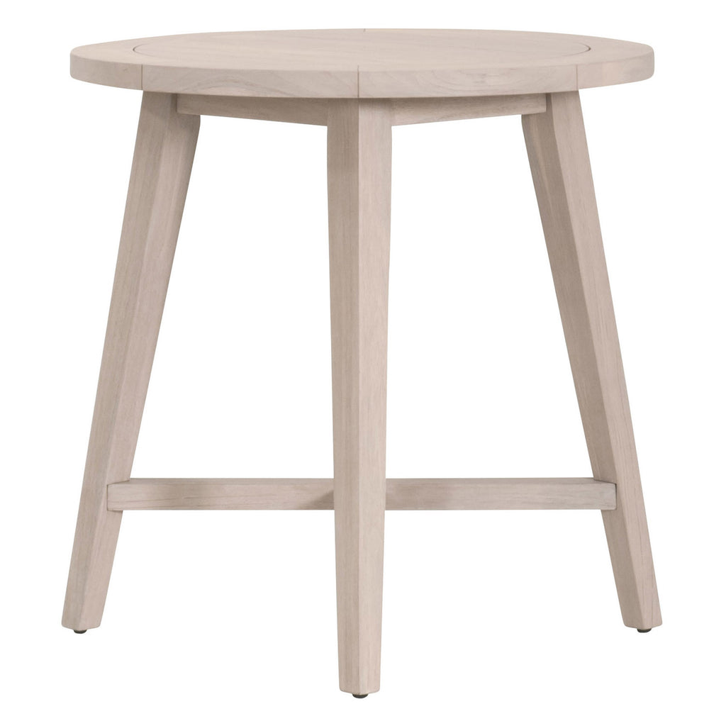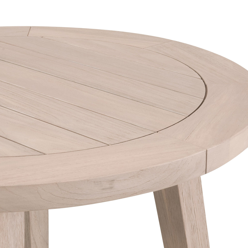Bring transitional style to your backyard with this Carmel Outdoor 36in Round Counter Table by Essentials For Living. It measures 36in round and 36in high. This small pub table is suitable for outdoor use with its solid teak wood construction. The teak wood features a lot of natural oils, making this table ideal for backyard patios and porches. However, it should be stored away in extreme conditions. The washed ever finish gives the teak a very natural look. The table also features an "x" leg stretcher brace for extra support. Seats two people while enjoying the outdoors with the slat-style wood table. Woven Collection's Washed Ever Teak is a multi-step hand-applied finish. A wire brush is first used to distress the wood by hand before applying a polyurethane finish that is designed to resist naturally occurring wood finish changes from the outdoor elements. Due to the hand-applied nature of the finish, uneven application or uneven wire brushing is possible. Washed Ever Teak finish may fade and wear over time, and as the finish deteriorates, the natural teak underneath will become visible and gradually turn grey. The rate of this weathering will vary based on factors such as climate, exposure, and maintenance levels. To protect your furniture from the elements and minimize aging, we strongly recommend using outdoor covers.