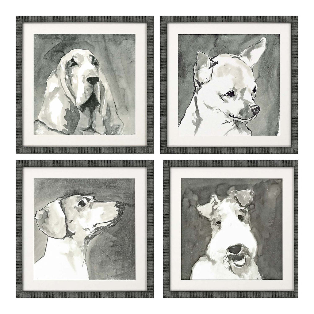 Sweet doggy faces are matted in white. Framed in a distressed black finish molding with gray wash and black side. Sold as set of four.