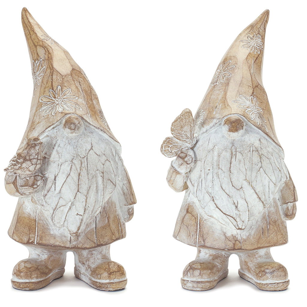 Elevate any space with these beautiful Carved Spring Gnome Figurines and add a whimsical touch of nature to your home. Crafted from premium resin materials, our figurines feature an elegant and modern carved design in neutral white and beige tones. With a white-washed finish and etched floral design, these unique pieces will bring sophistication and style to your living room, office, or bedroom. Whether you're looking to add a personal touch or enhance any space, these Carved Gnome Figurines are perfect for the job.