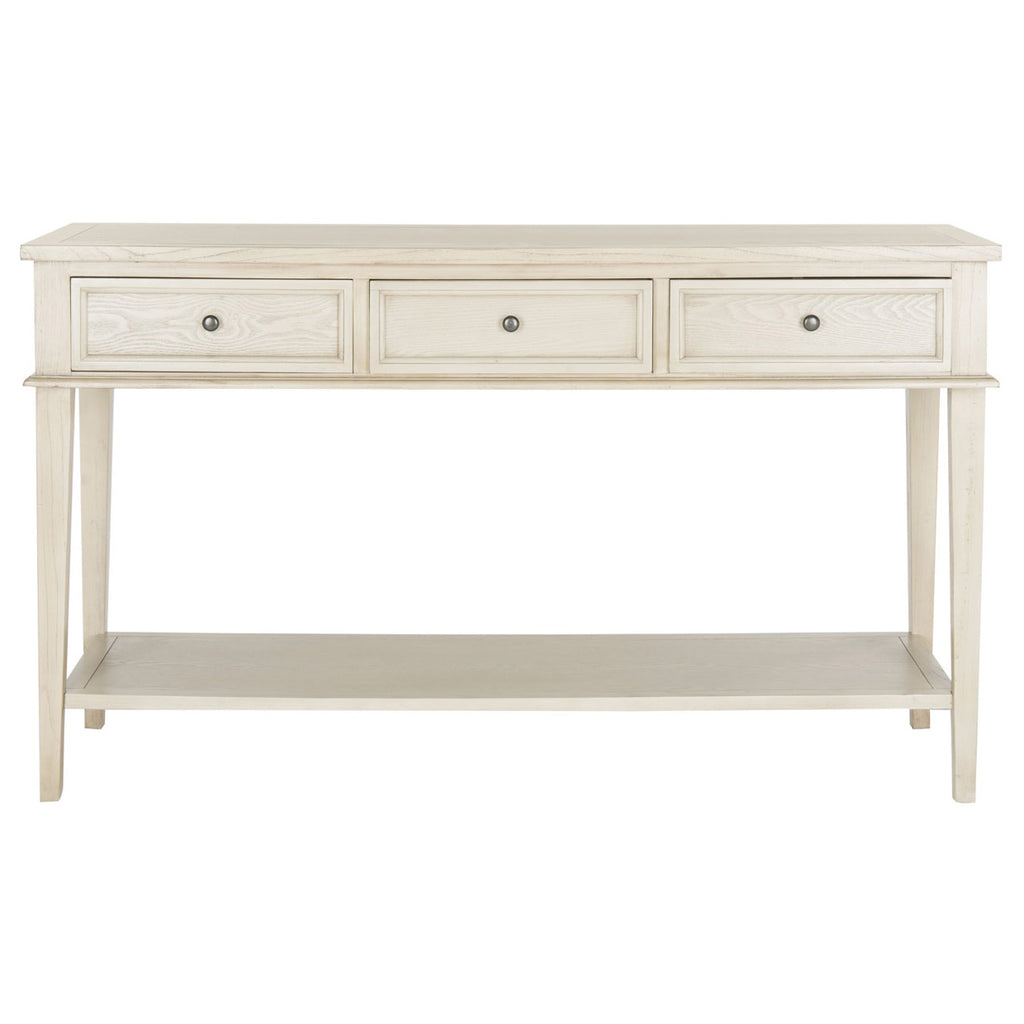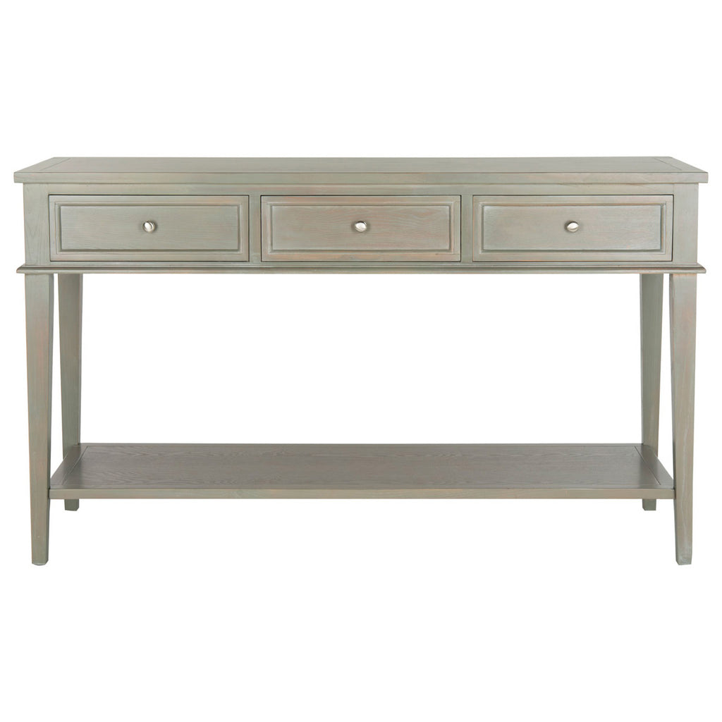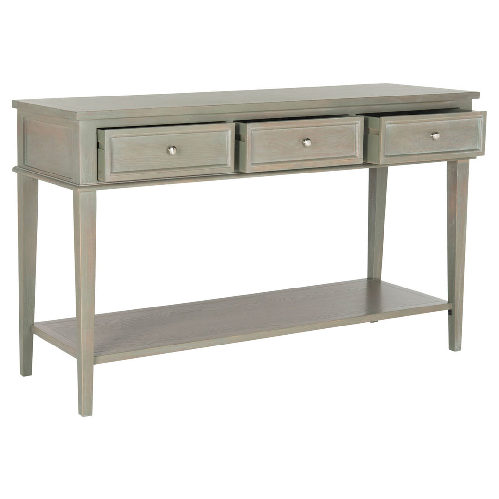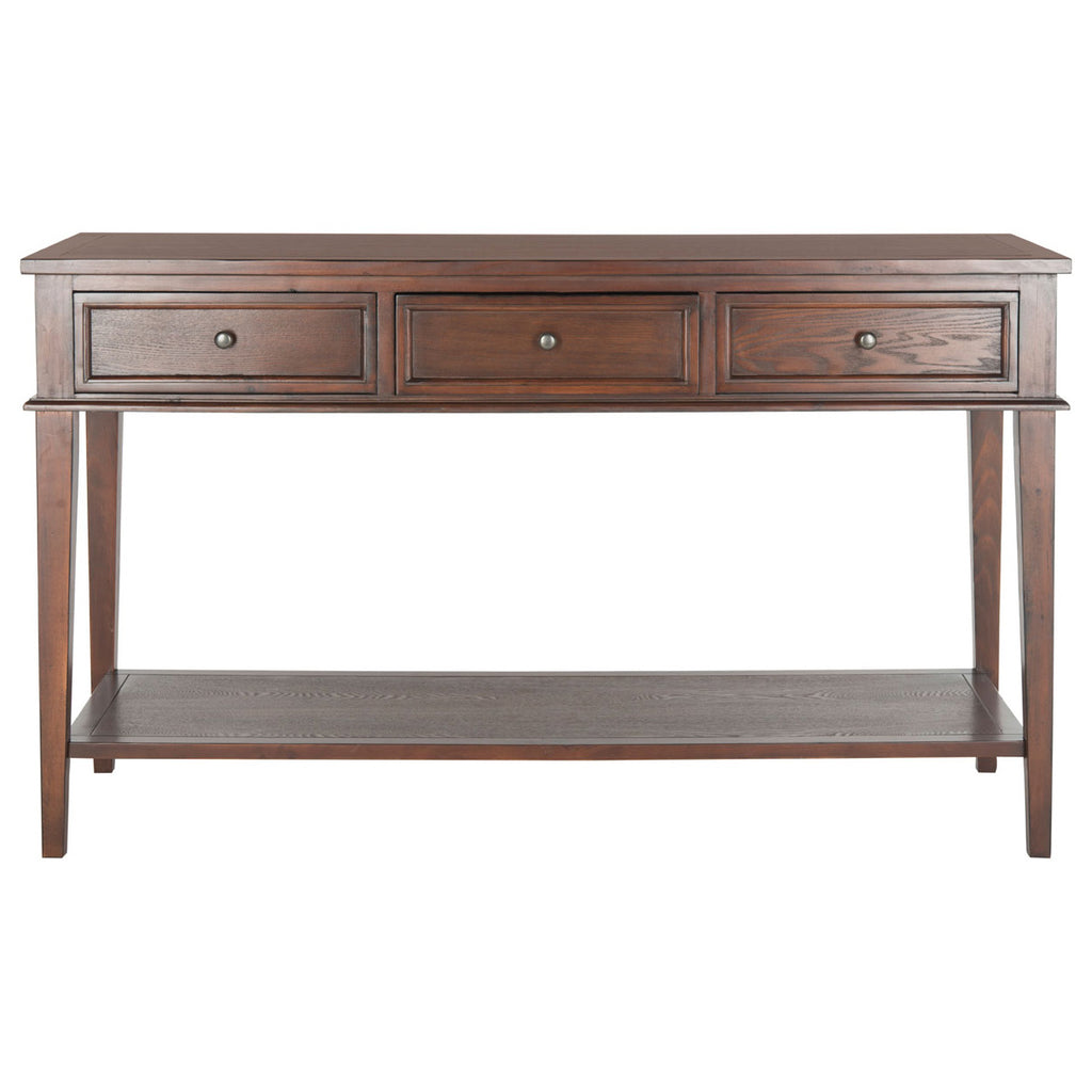 Simple lines and purity of function lend a timeless quality to the Shaker-inspired console with tapered legs, three drawers and lower shelf. Crafted of pine in a sepia finish, this console is at home in country, rustic or transitional settings.