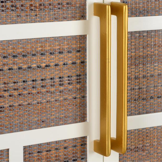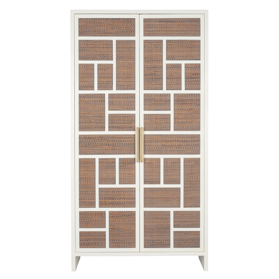 This cabinet becomes the striking focal point of a room with its contemporary geometric design paired with the beautiful traditional aesthetic of wood and cane. The interior features four adjustable shelves and the exterior sports sleek gold hardware. Designed by Shayla Copas.