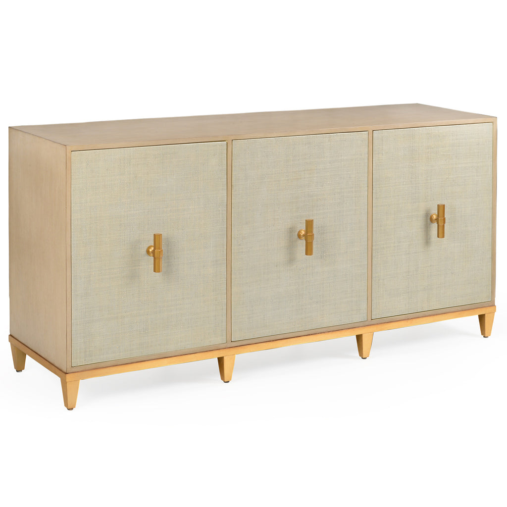 This console table from Chelsea House invites contemporary sophistication to your home. Simple and chic, this piece's sleek silhouette delights with modern elegance. The Chelsea House Avery console cabinet features White, Navy, or Weathered Gray raffia covered doors and gold leaf finished hardware. Not intended for clothing storage.