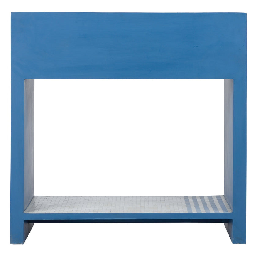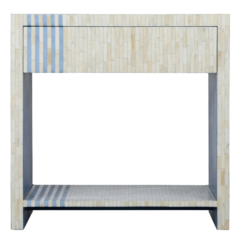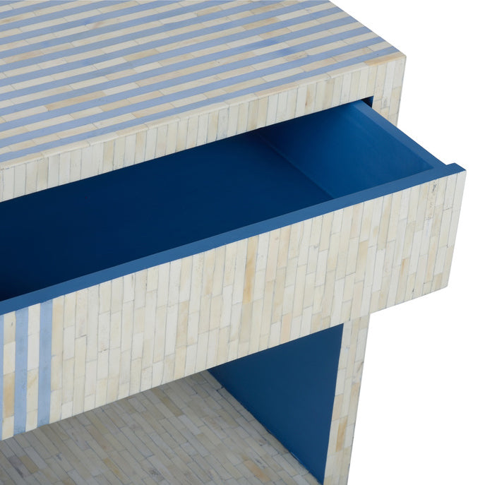 The bedside table blends beauty and function in a piece that can be used in a variety of places in a home. The exquisite craftsmanship includes hand cut bone inlay in a geometric pattern and a sleek drawer with metal glides that easily functions with no knob.