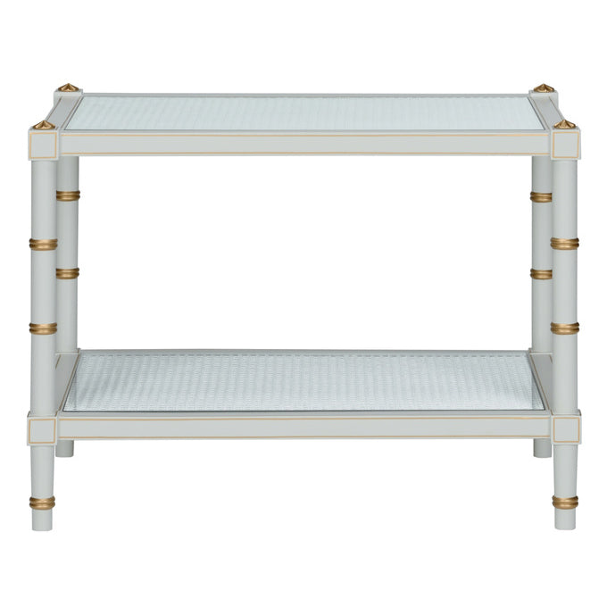 The Connor Cocktail Table in blue is adorned with gold hand-painted detailing around the edge of the bamboo-inspired legs and natural caned shelf. Perfect for any room that needs a pop of color. Designed by Bill Cain.