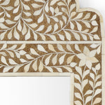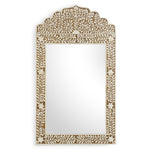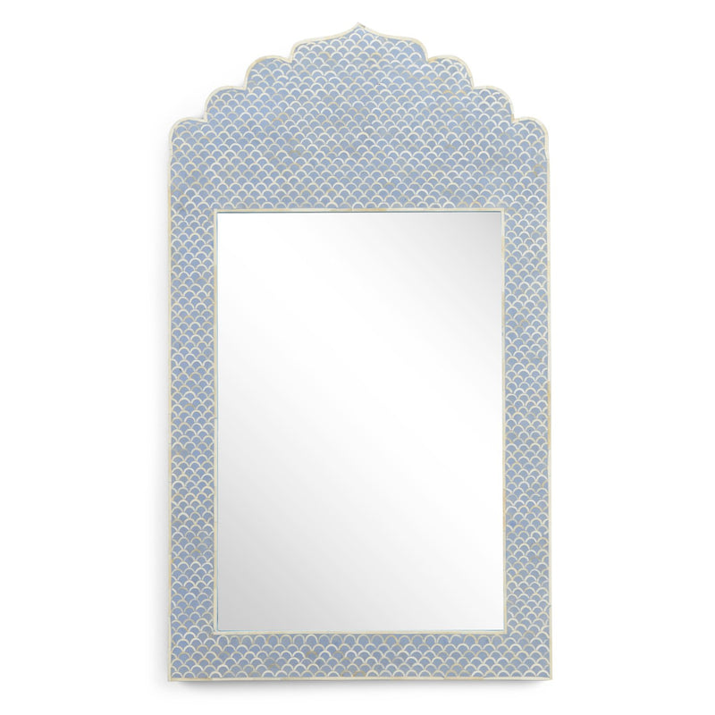 This wall mirror makes a bold, modern statement in a bedroom, hallway or dining room. Effortlessly glamorous, this grandiose accent can't help but catch the eye. The Chelsea House Crown wall mirror in Brown and White or Blue and Cream bone inlayed wood with clear plain mirror.