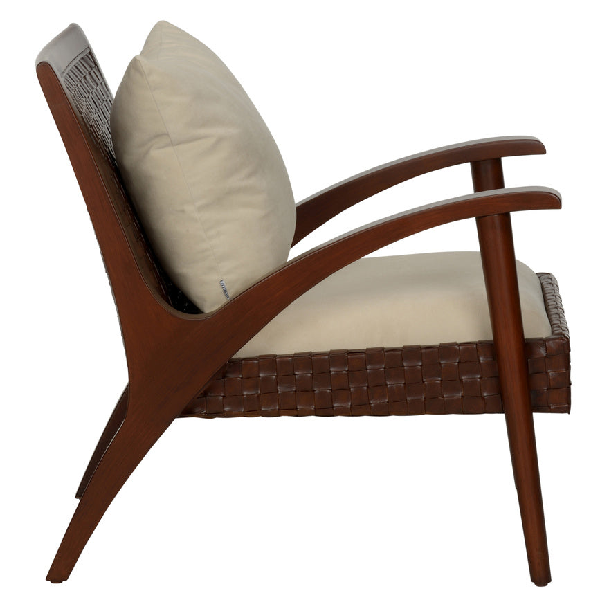 The Drew Leather Chair has a mahogany finish on curved legs and arms to create a mid-century modern shape. The classic basket weave of the leather brings a handsome chair for your living room. Finished with a neutral cream cushion to fit in any aesthetic.