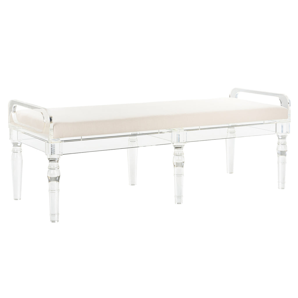 Bring a modern touch with a classic feel. The Masters Acrylic Bench is upholstered in a neutral muslin cloth with a sophisticated shape in clear acrylic. Designed by Bill Cain.