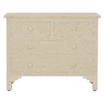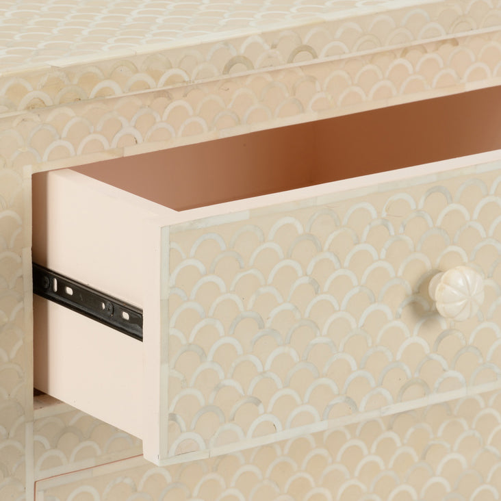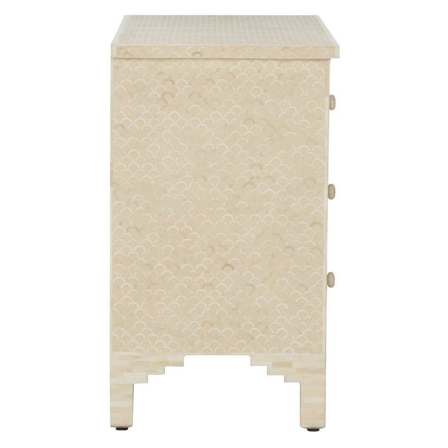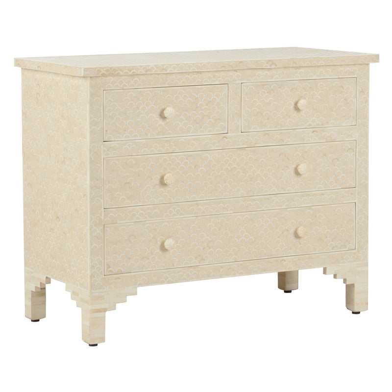 Create a unique and beautiful focal point in your home with this artistic chest. The Milford Chest features a natural and white bone fish scale pattern hand laid by skilled artisans. The sophisticated artistry and natural characteristics of the bone make each piece unique. This four drawer chest is ideal for a bedroom, entryway or living area. Top with a chic lamp and an accent piece to complete your coastal decor. Not intended for clothing storage.