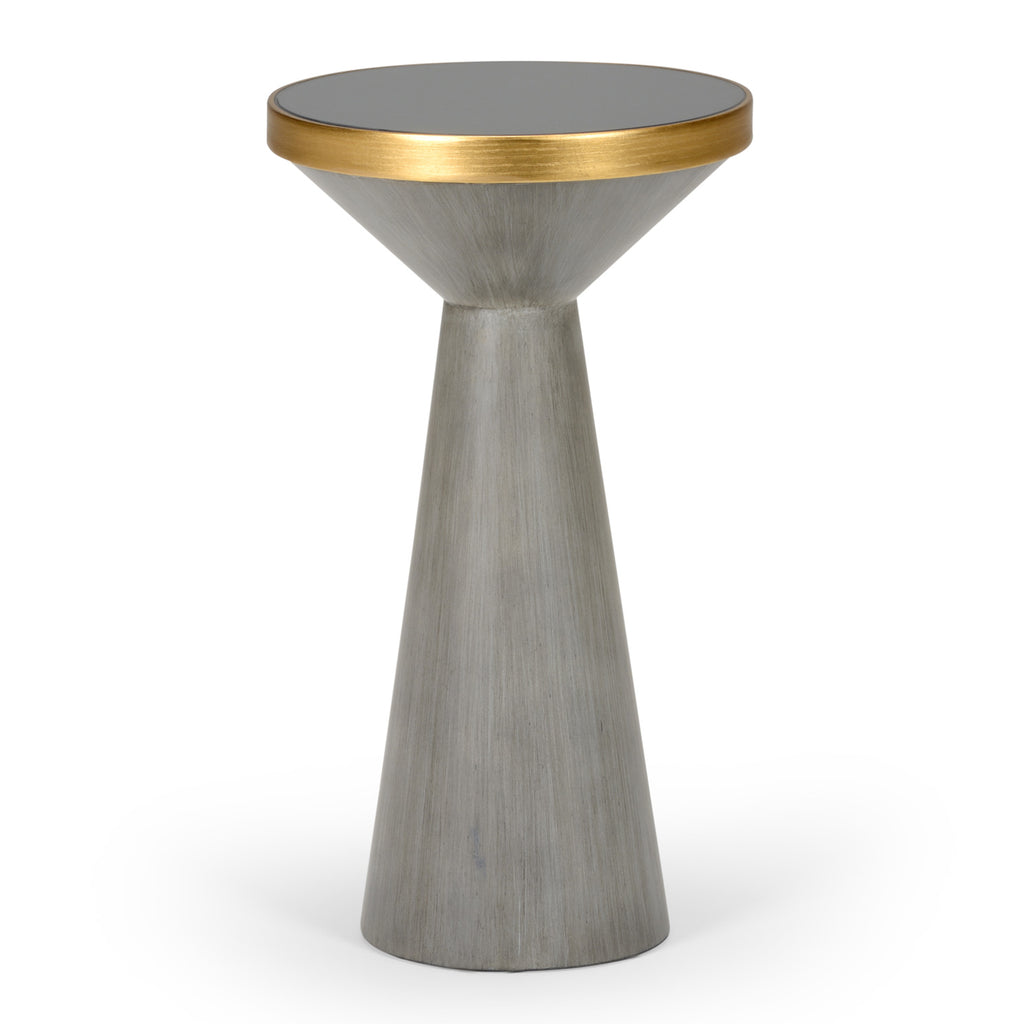 This table from Chelsea House intrigues in a bedroom or living room with contemporary style. Its clean lines express fresh modernity for a captivating statement. Mahogany finished wood with black glass top and antique gold edging or antique gray wash finished wood with dark gray glass top and antique gold edging.