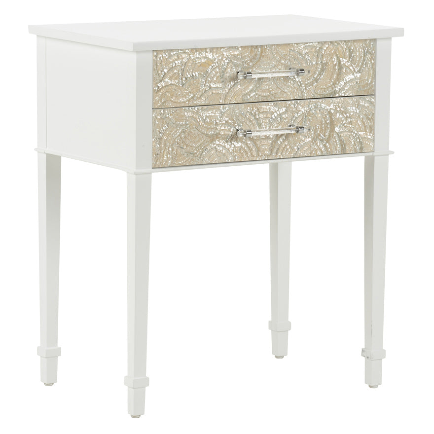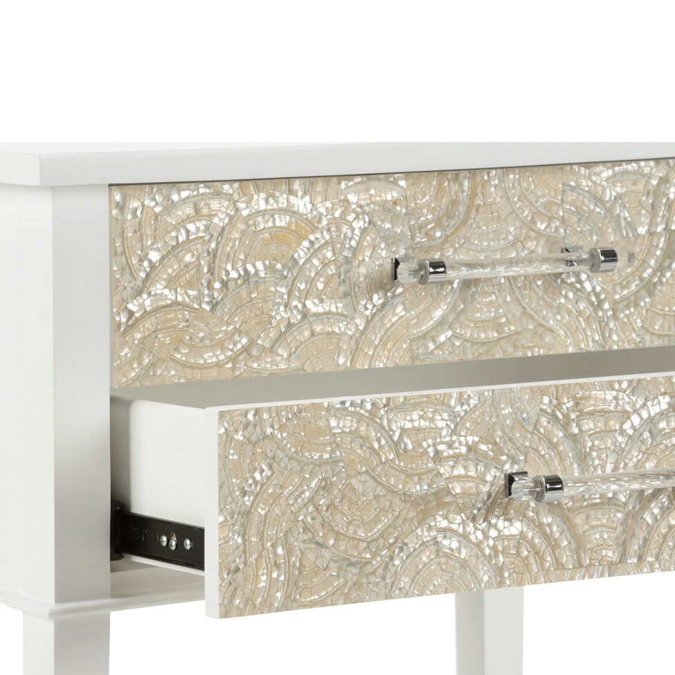 Mesmerizing at first sight, the Pembroke Side Table is simple and elegant with its beautiful clean white finish and exquisite mother of pearl detailing. Finished off with a touch of glamour from acrylic handles. Designed by Bill Cain.