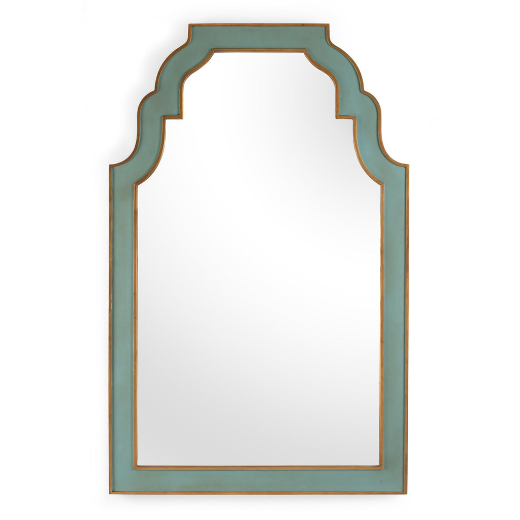 Chelsea House's wall mirror makes a bold, modern statement in a bedroom, hallway or dining room. Effortlessly glamorous, this grandiose accent can't help but catch the eye. Antique mint green painted wood, antique gold leaf edges and with plain clear mirror.