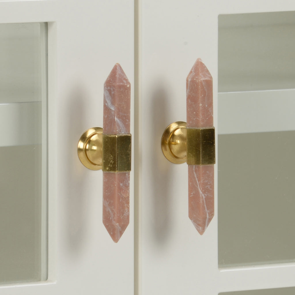 Making storage practical and aesthetically pleasing, the Silhouette Chest features a white painted finish with windowpane doors exposing the double shelving inside. Finished with rose quartz stone door pulls for a glamorous detail. Designed by Lisa Kahn.