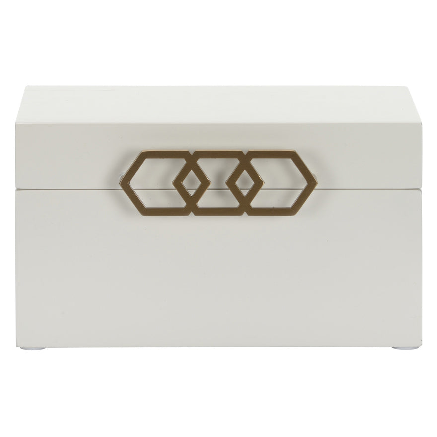Keep things tidy and hidden with the Tiffany Box. Comes in two sizes for multiple ways to store your items. Finished in a spectacular white and decorated with a gold honeycomb style latch for easy open and close. Designed by Shayla Copas.