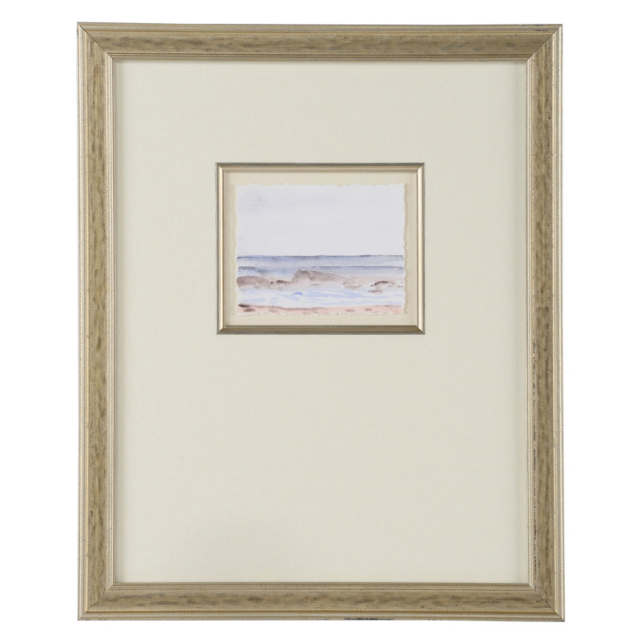 Silver leaf frame with fillet and linen mat. Framed in glass.