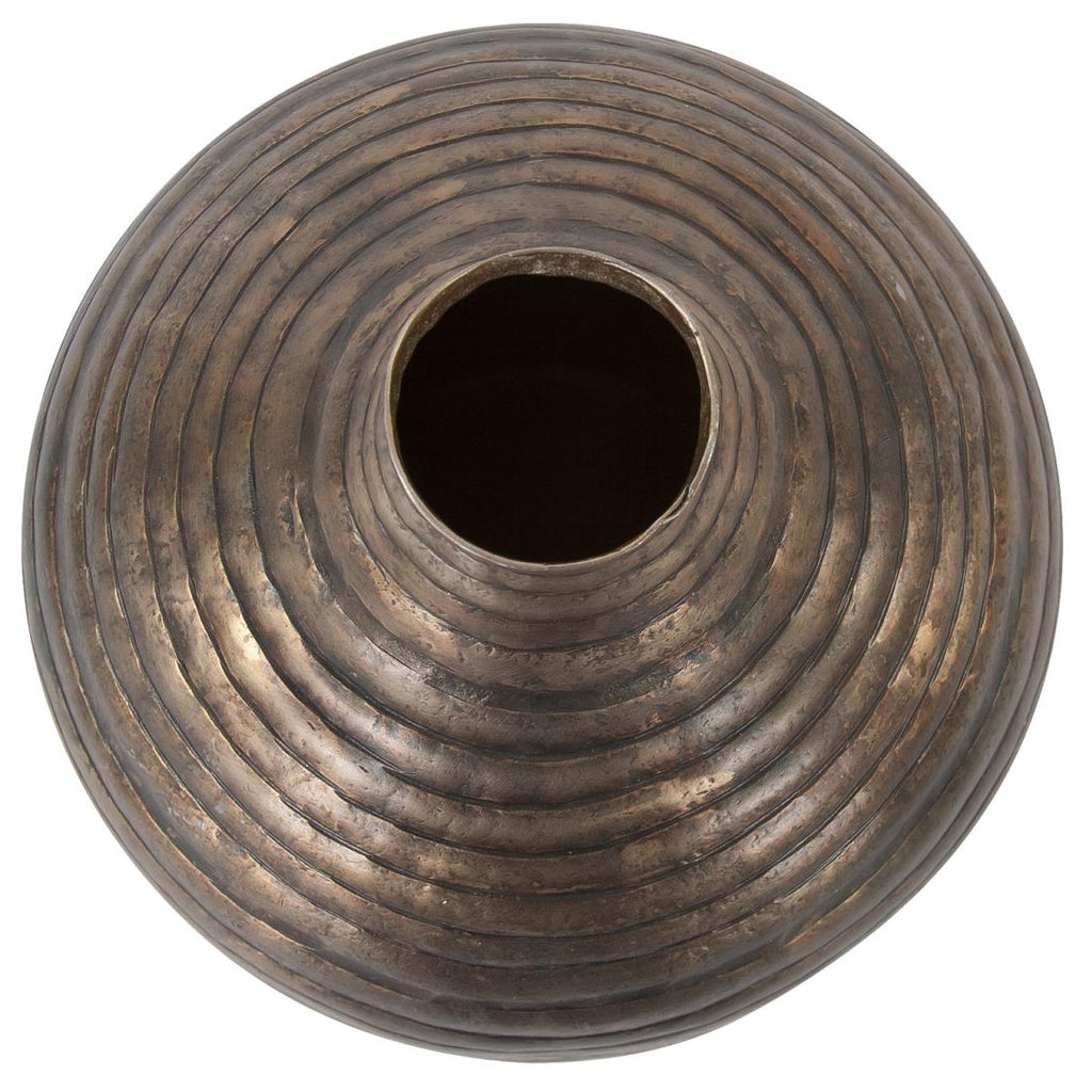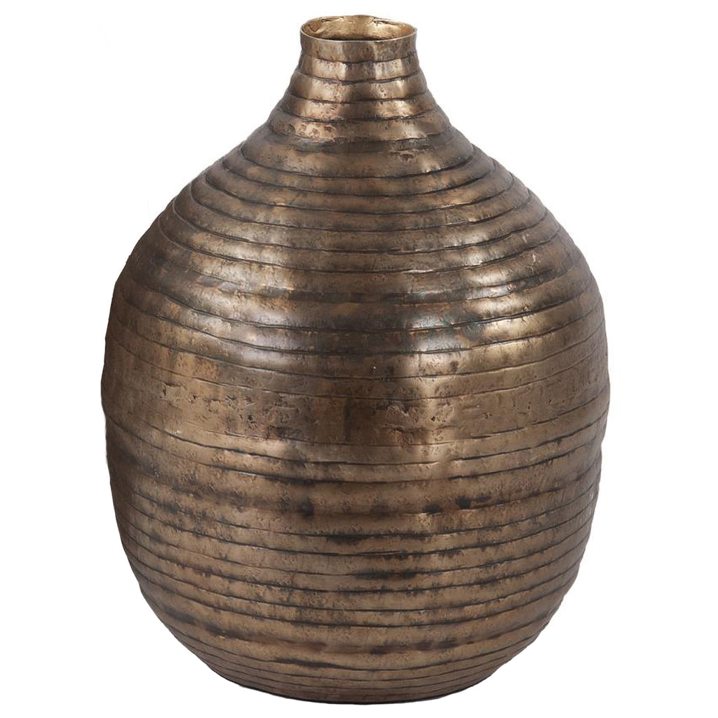 The Circlet collection was inspired by medieval crowns worn by nobility and royals of the time. Each piece was created by forging consecutive rings of metal together in a band. This pattern has been recreated and embossed into aluminum sheeting. Using the embossed aluminum sheeting, craftsmen cut and forge vessels.One such vessel is our small bottle vase, which is highlighted in a deep aged gold finish. This collection has a rustic charm, that can work as easily into a casual country setting as it can in an urban industrial.