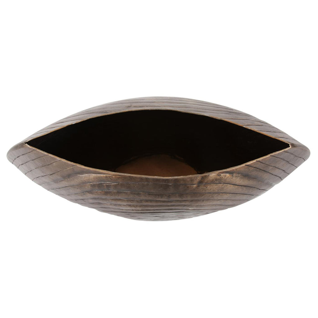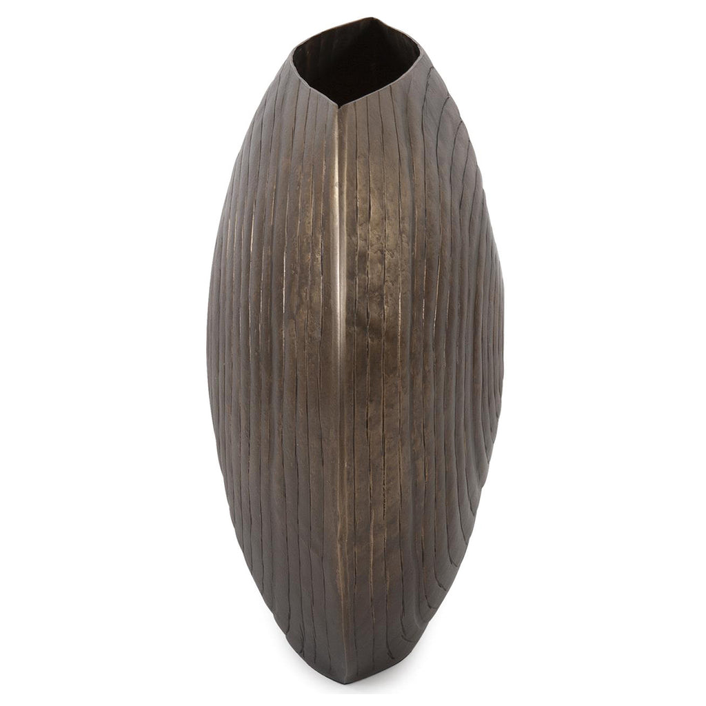 The Circlet collection was inspired by medieval crowns worn by nobility and royals of the time. Each piece was created by forging consecutive rings of metal together in a band. This pattern has been recreated and embossed into aluminum sheeting. Using the embossed aluminum sheeting, craftsmen cut and forge vessels. One such vessel is our medium disc vase, which is highlighted in a deep aged gold finish. This collection has a rustic charm, that can work as easily into a casual country setting as it can in an urban industrial lifestyle.
