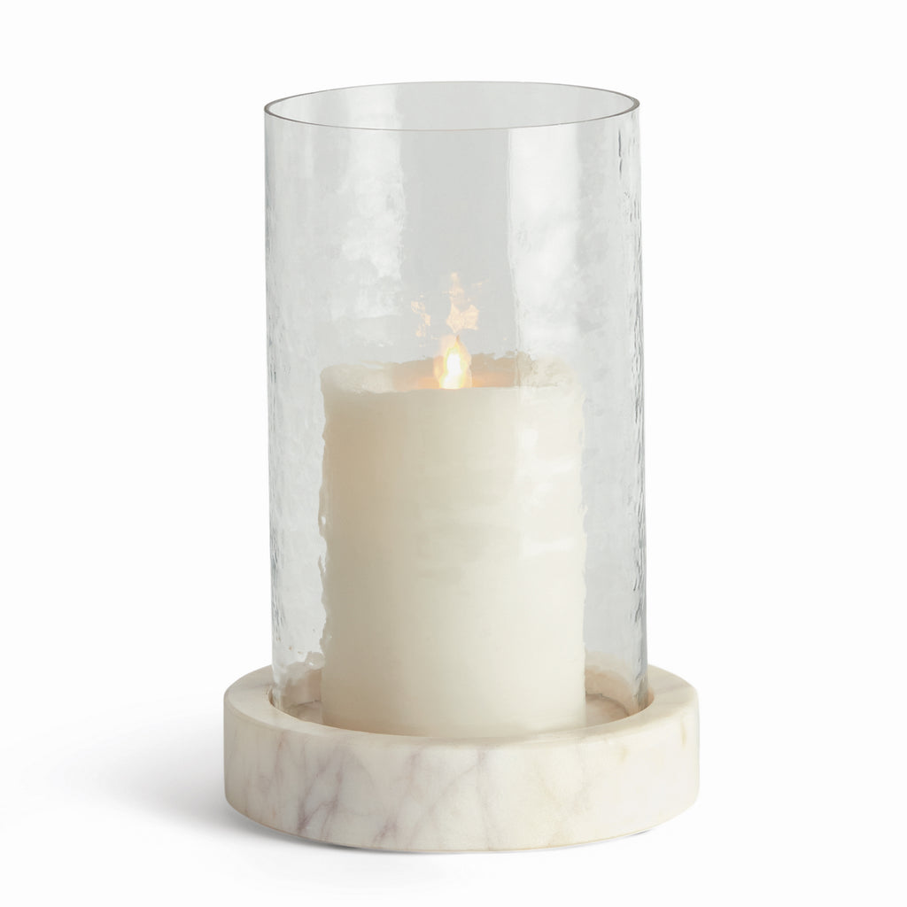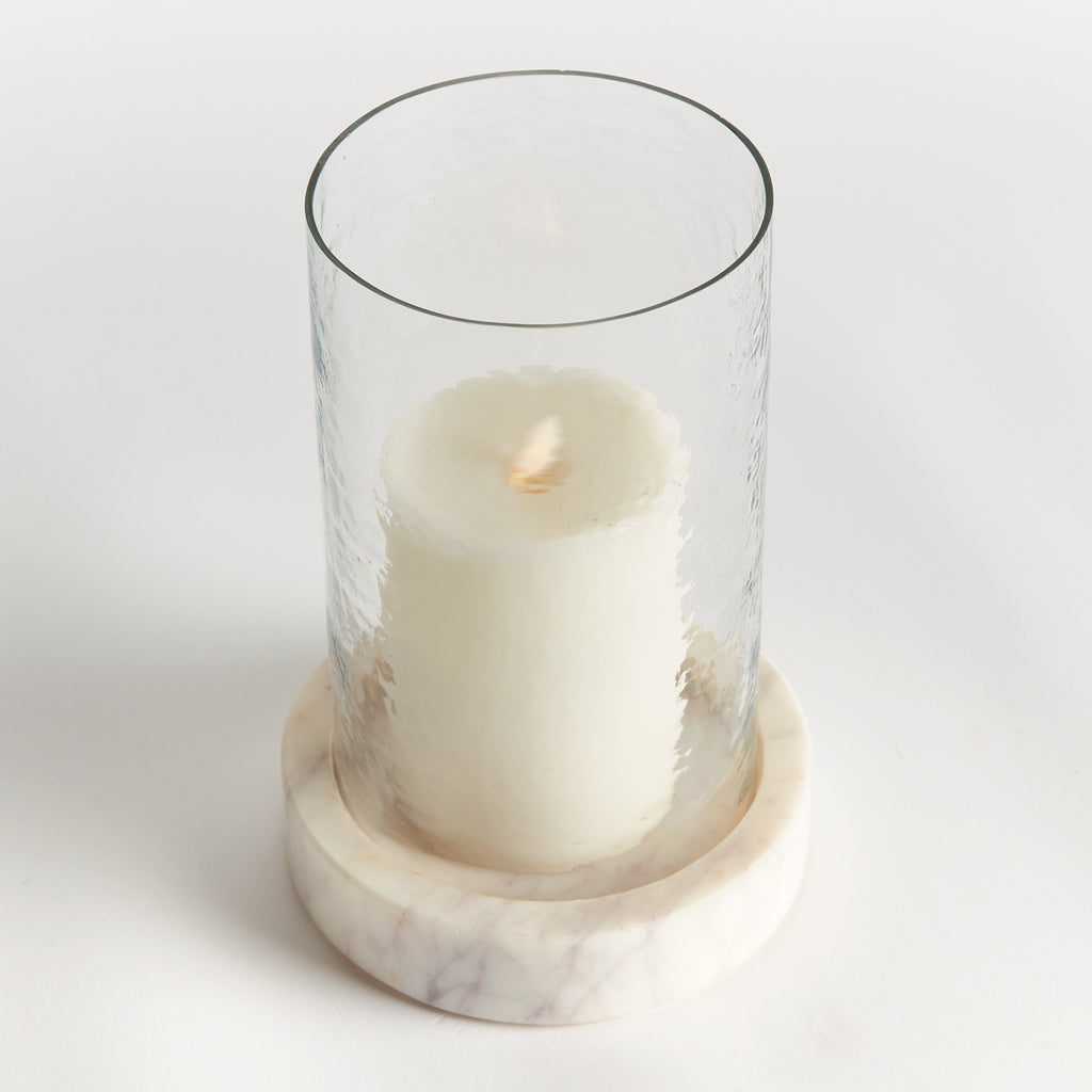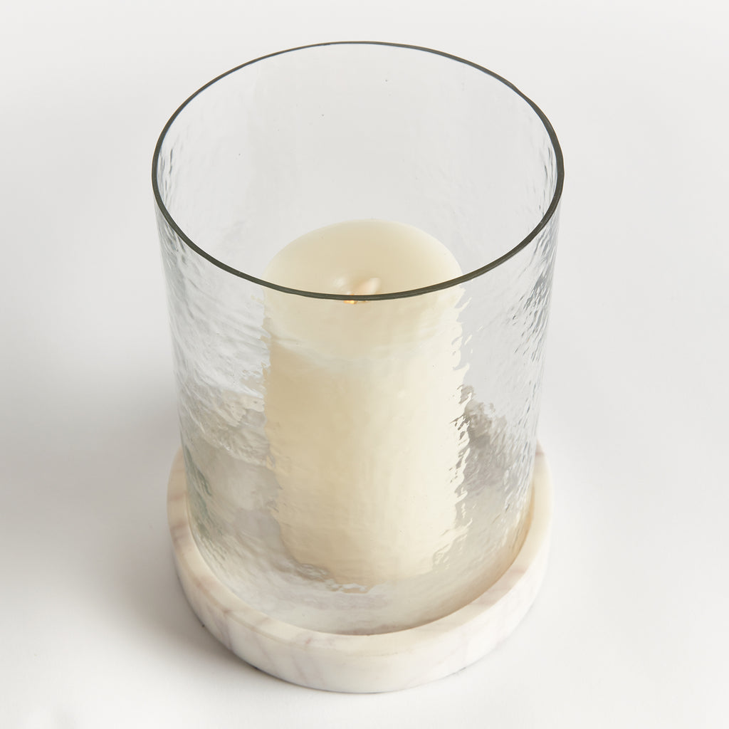 With a hammered glass vessel that sits inside a simply marble tray, this hurricane is decidedly modern. The hammered glass adds a bit of texture to the otherwise understated design. A beautiful addition to kitchen island, coffee table or ottoman.