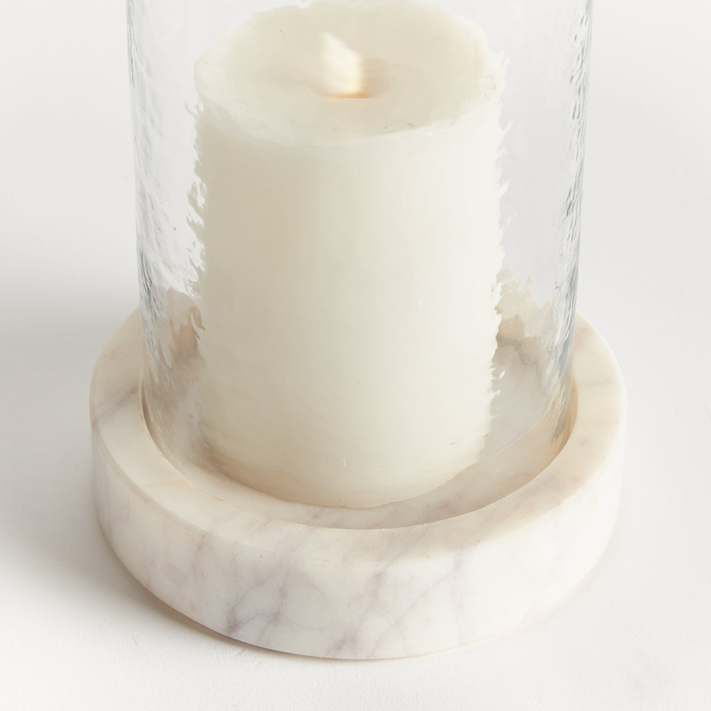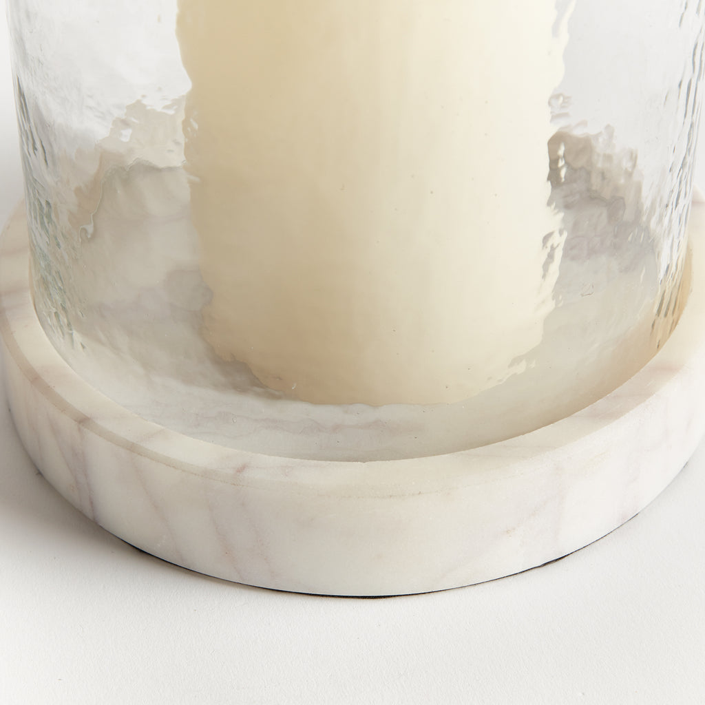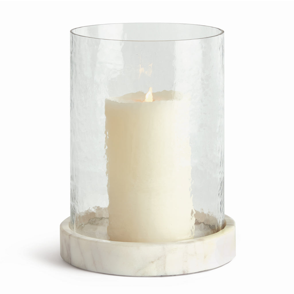 With a hammered glass vessel that sits inside a simply marble tray, this hurricane is decidedly modern. The hammered glass adds a bit of texture to the otherwise understated design. A beautiful addition to kitchen island, coffee table or ottoman.