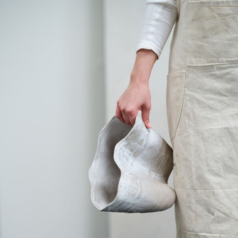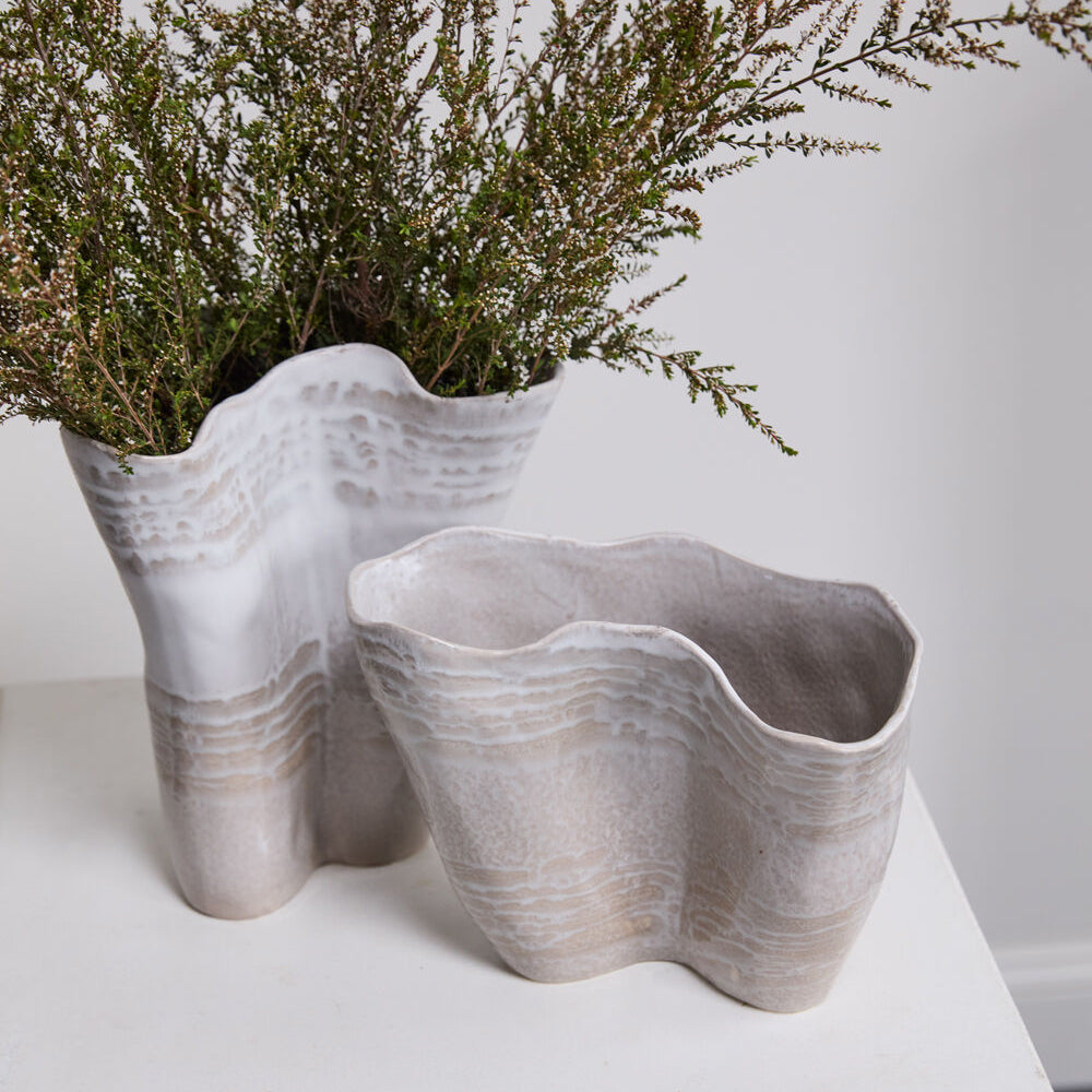 Bring a handcrafted look to florals with the wavy ceramic Claribel Vase. Featuring a super organic shape with unique folds & surface texture, this unique vase is both a sculptural decorative piece & modern vessel for statement arrangements. The base color is warm grey, while a brushed white reactive wash is applied horizontally to offer a drippy, trickled down look. Layer both sizes together for a coordinated display.