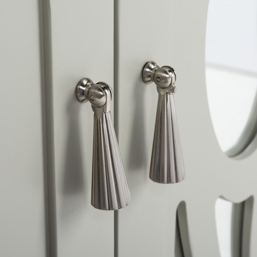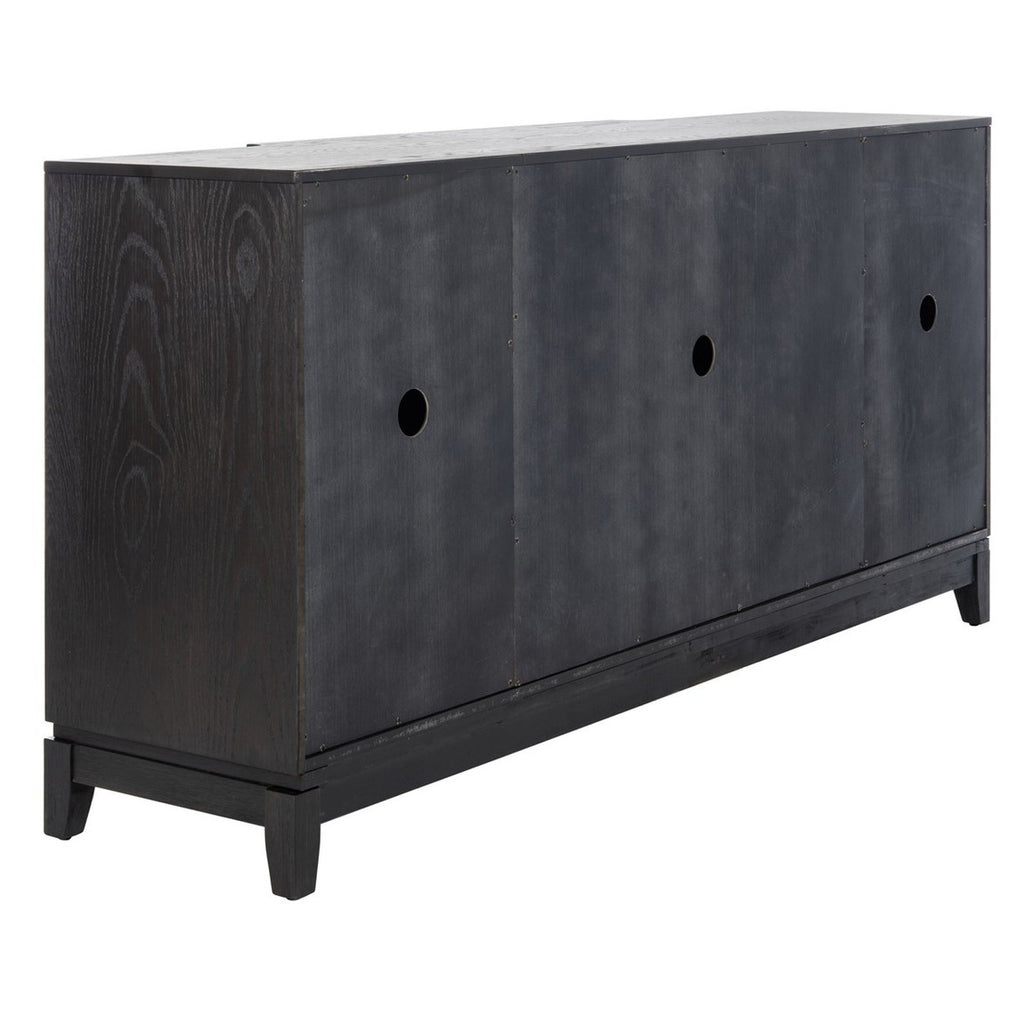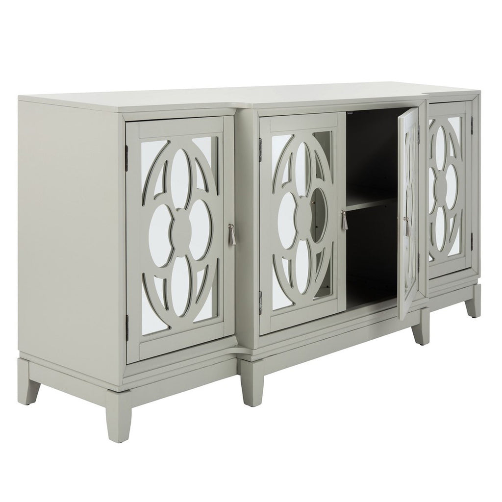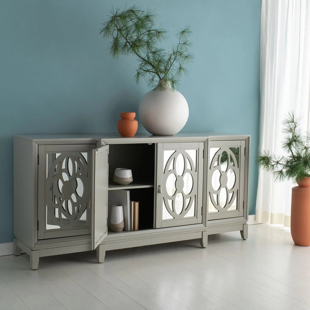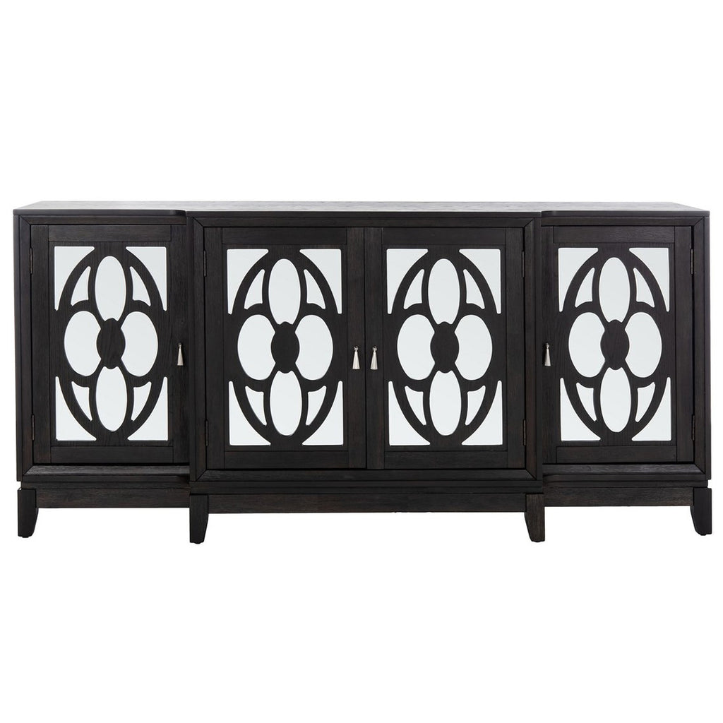 Designed to highlight its fine craftsmanship, this gracious mirrored sideboard is a captivating focal point in any dining room. Ideal for entertaining, its expansive wood cabinets are adorned with chic mirrors ornately framed by a classic cut-out pattern.