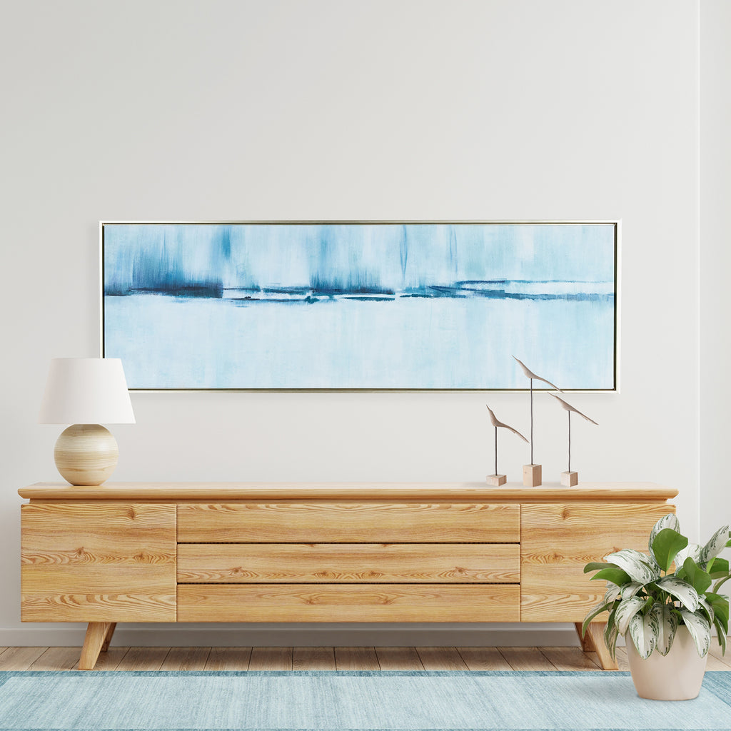 Like a misty morning out on the water, this large-scale giclee on canvas is a serene composition in monochrome tones. Hand-embellished highlights with touches of paint creates a rich texture and depth. Finished off beautifully in a frame with spacer, allowing the sides of the printed canvas to show.