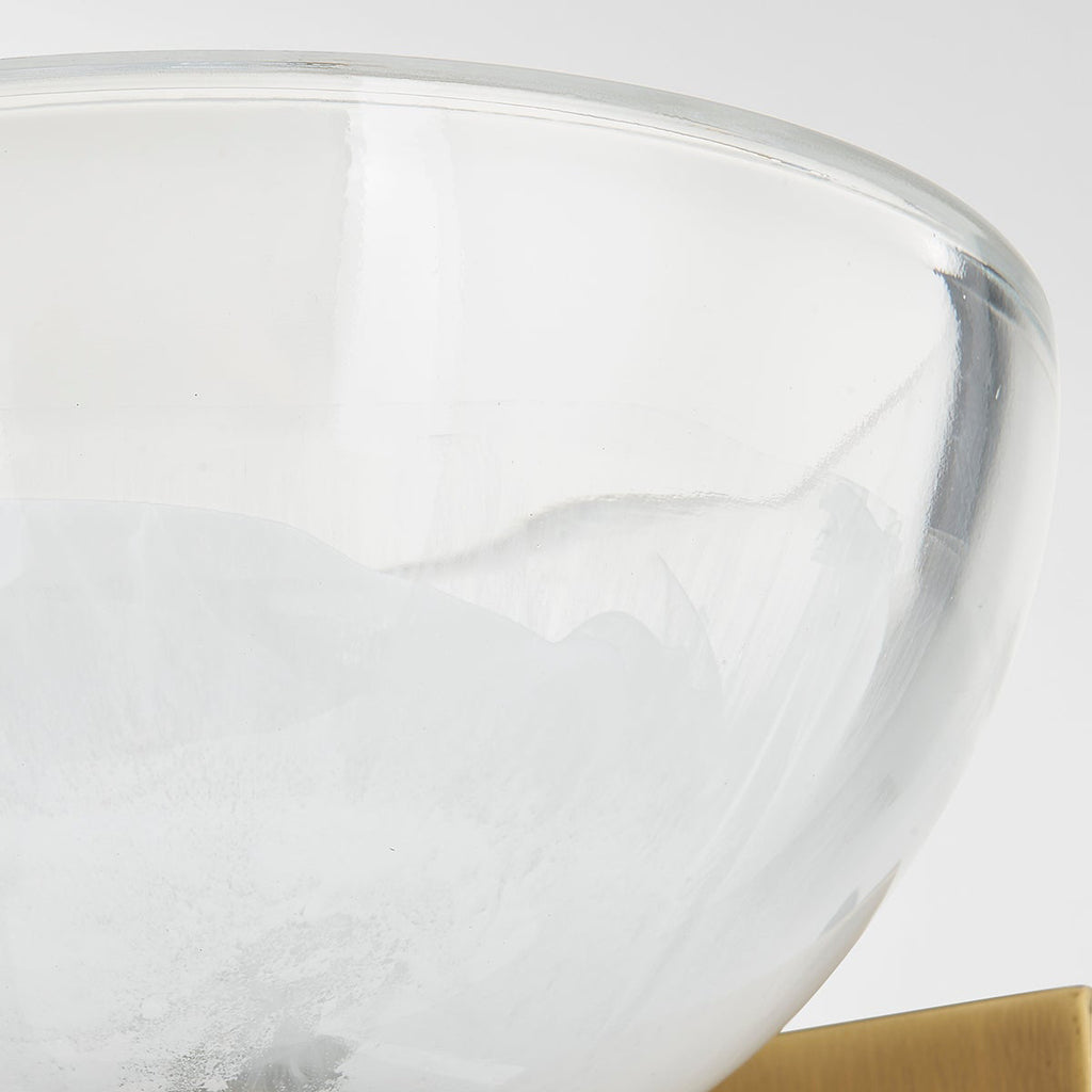Troy Valen Wall Sconce's glass dome shade has a gorgeous two-tone effect. Light brings out the texture and detail of the glass and highlights its simplistic beauty. A Patina Brass arm and square backplate add to the modern look. This wall sconce can be mounted to provide uplight or downlight.