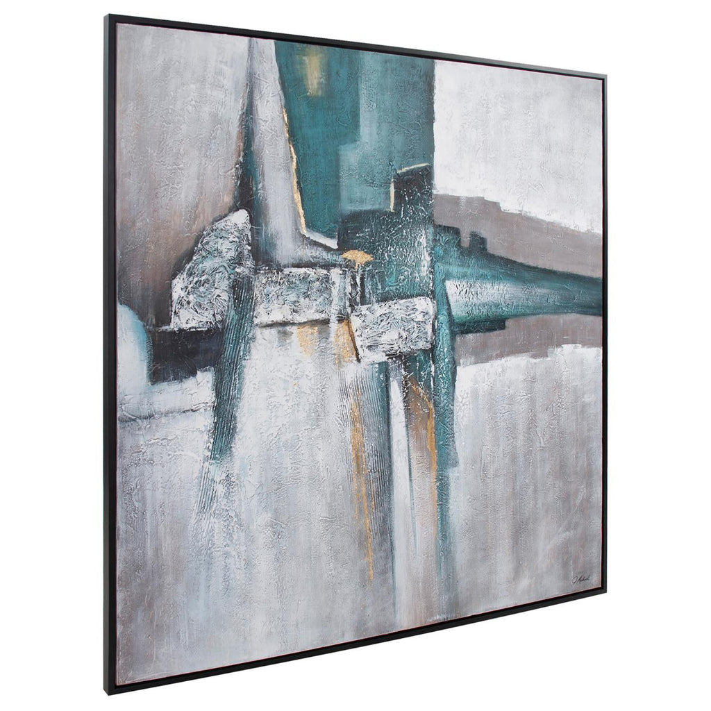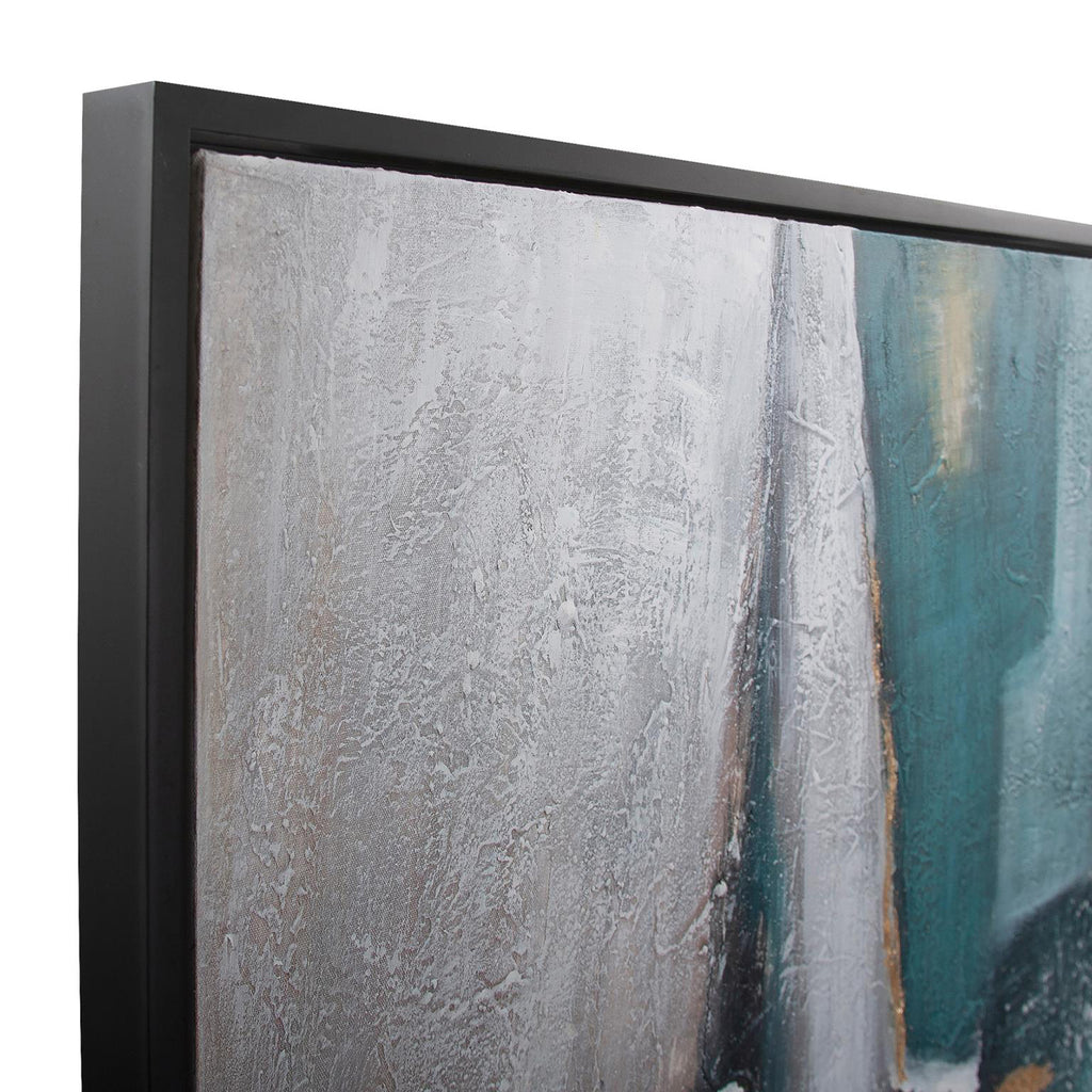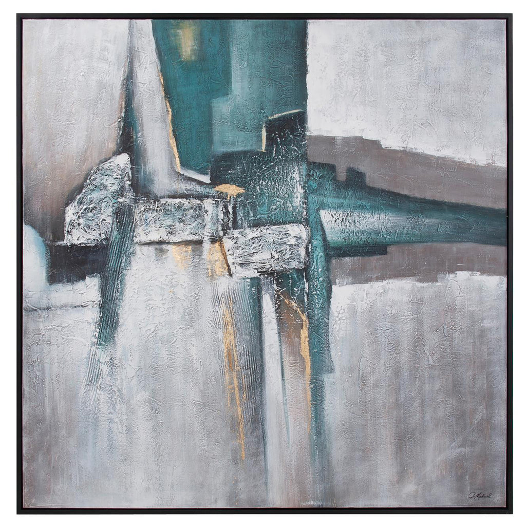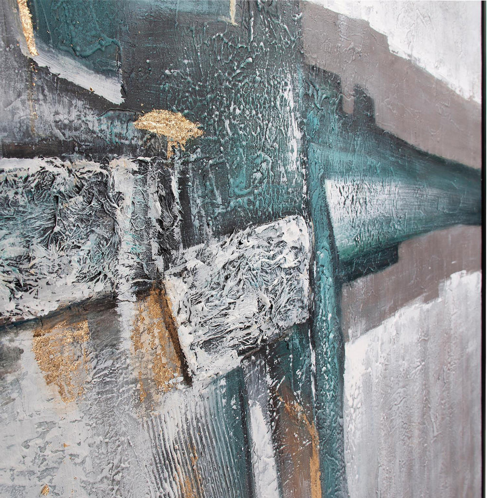 The layering of various shapes cut out of paper was the basic start for the work entitled Color Split. Once the basic shapes were laid out, I started to add my layers of paint and gesso. The build up of the layers along with some added material the work started to come to life. The deep rich teal color tones and the slight hint of gold leaf highlights the original idea of splitting colors.
