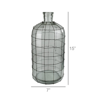 A heavy glass bottles is artfully wrapped in copper wire in a grid pattern creating an amorphous vessel and a statement worthy decorative object.