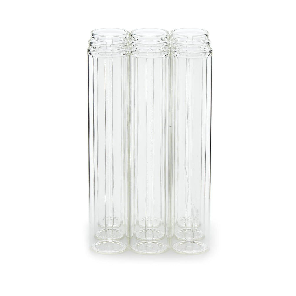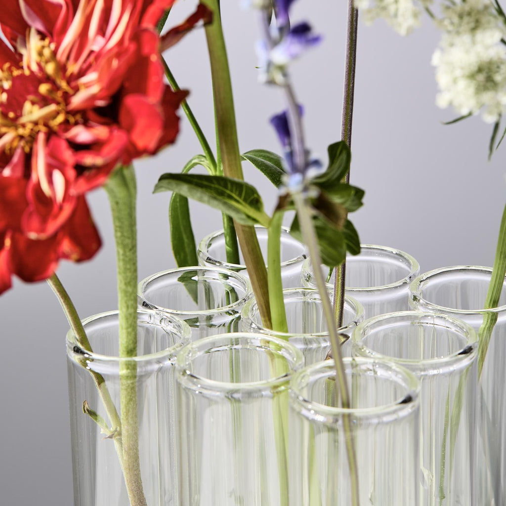 Create a stunning centerpiece with the Set of 9 Connected Tube Flower Vases. This exquisite glass arrangement is perfect for showcasing your favorite blooms, adding elegance to any room.
