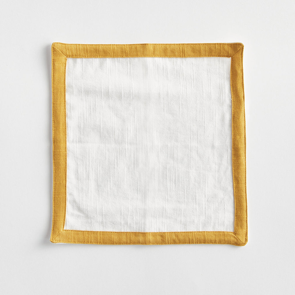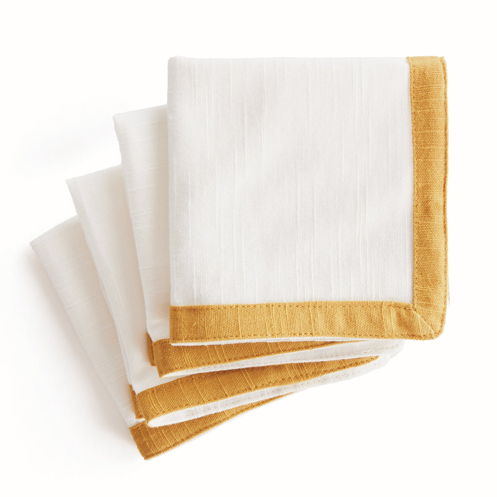 Bring a touch of softness to the table with this set of four 100% woven cotton napkins. Beautiful in tone and texture, the white & ochre combination is made to coordinate with any tablescape.