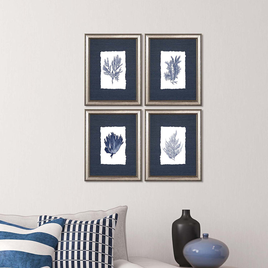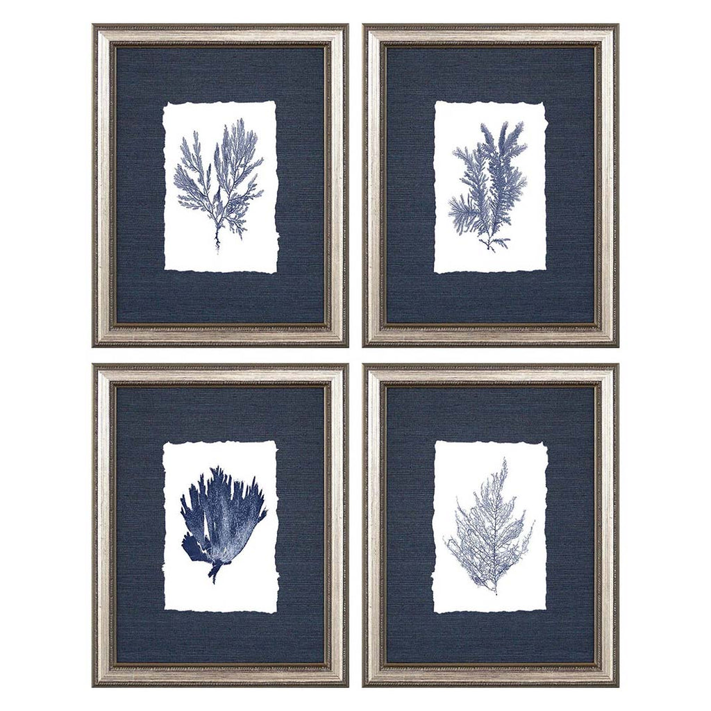 Images are hand deckled and mounted on blue sisal grasscloth. Framed in a silver leaf wood molding. Sold as set of four.