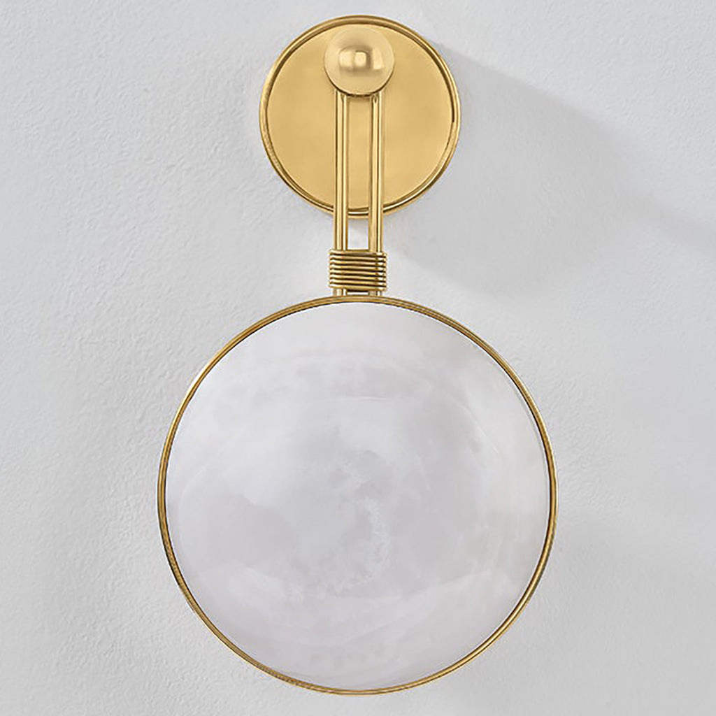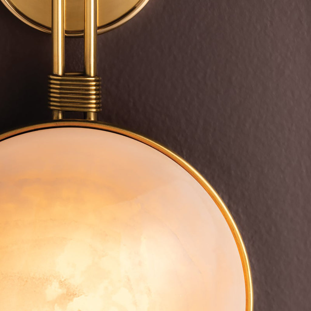 Reminiscent of a dangling jewelry charm, Corbett Lighting Ares Wall Sconce lends an otherworldly beauty to modern interiors. When illuminated, the central LED-lit ice onyx lens glows with a mesmerizing mother-of-pearl-like iridescence. Subtle details, from the stone finial detail to the ribbed metalwork, contribute to the artisanal feel of this wall light. Finished in warm Vintage Brass, Corbett Lighting Ares adds a note of luxury to a hallway, powder room, or bedside.