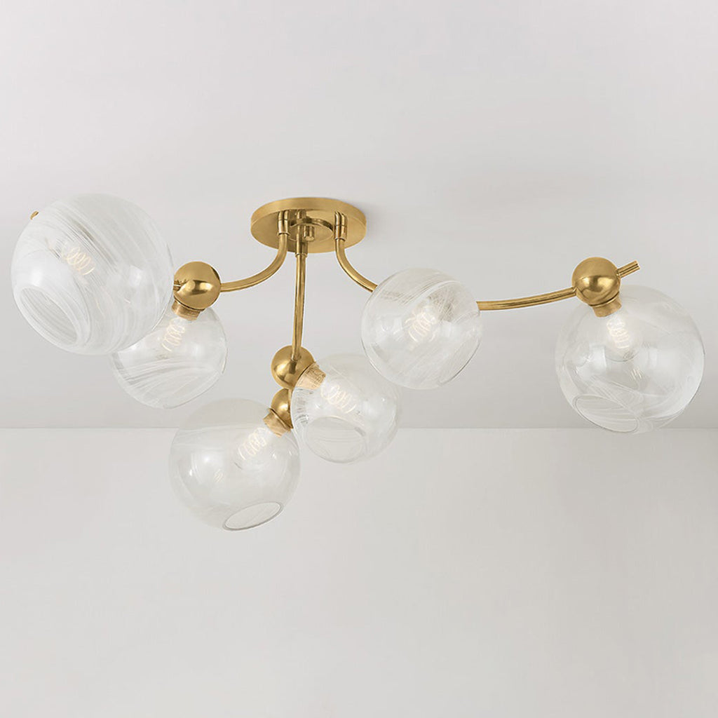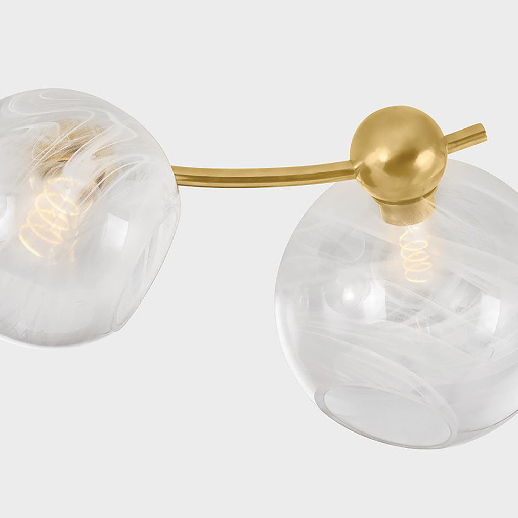 Resembling celestial bodies in the sky, the sparkling Corbett Lighting Astraia suspends elegantly from the architecture of a room. Swooping in different directions, the delicate Vintage Brass stems create an evenly scattered composition with 6 or 9 Remolino Blanco glass globes. The choice between multiple stem sizes results in a bespoke appearance with a more tightly arched or rounded silhouette. The swirling effect of the handblown glass complements the fixture, emphasizing its artisanal nature.