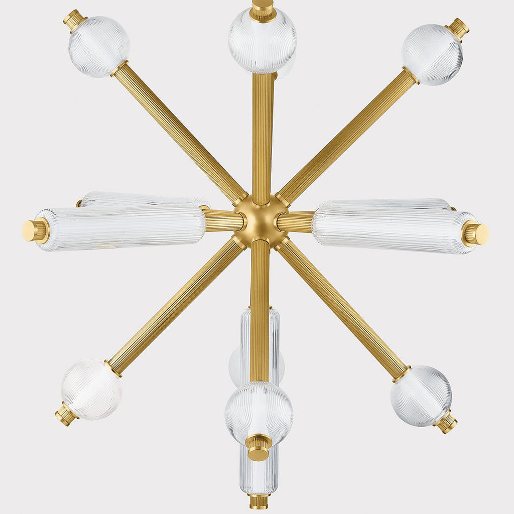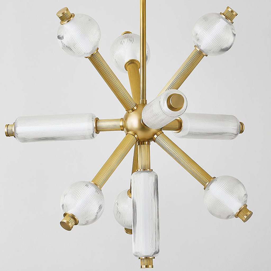 A nature-inspired spin on an iconic mid-century sputnik design, Corbett Lighting Atom brings a burst of illumination to modern interiors. This dynamic composition features glass spheres and cylinders that are brilliantly lit by energy-efficient LEDs. The reeded detailing of the arms is accented by smooth metalwork in a Vintage Brass finish. Corbett Lighting Atom is available as a 2-light wall sconce and 10 or 13-light chandeliers.