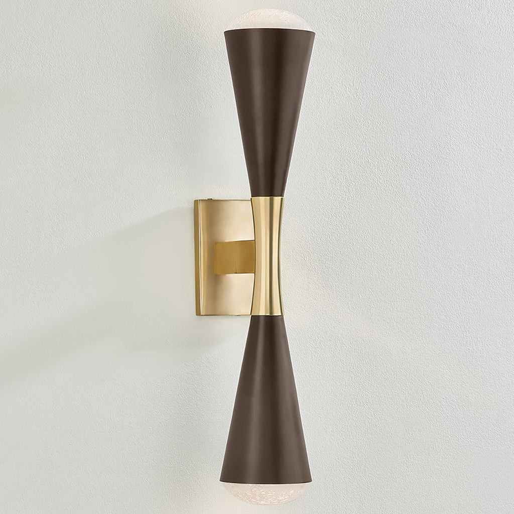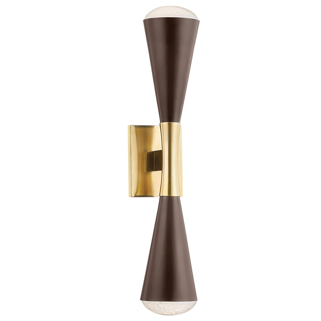 A sconce that is simple yet statement-making. The slender silhouette of Corbett Lighting Barcelona tapers outwards on either end, culminating in two Clear Fizz Glass lenses with interior etching. The resulting dewdrop effect softens the clean lines of the fixture and creates a beautiful glow when lit by the integrated LED light source. Corbett Lighting Barcelona is available in a Vintage Brass or Vintage Brass/Bronze finish.