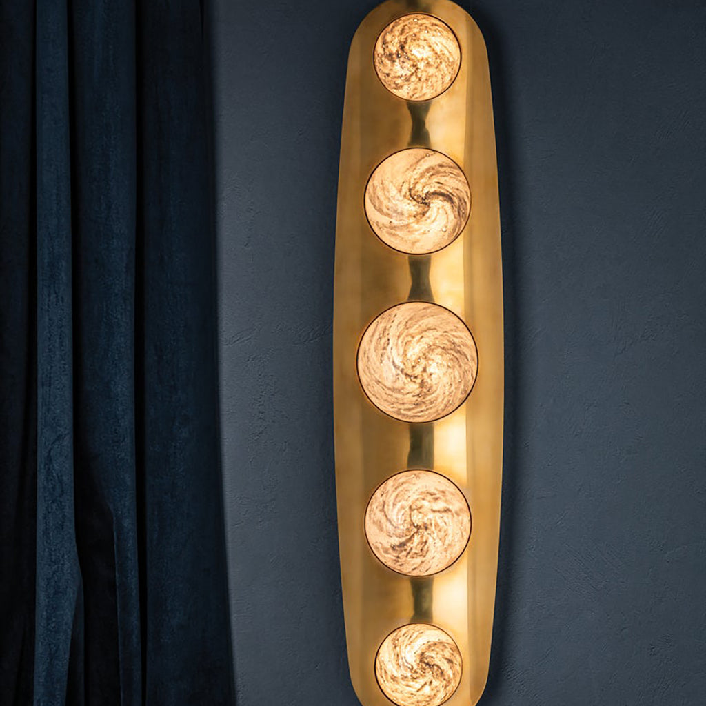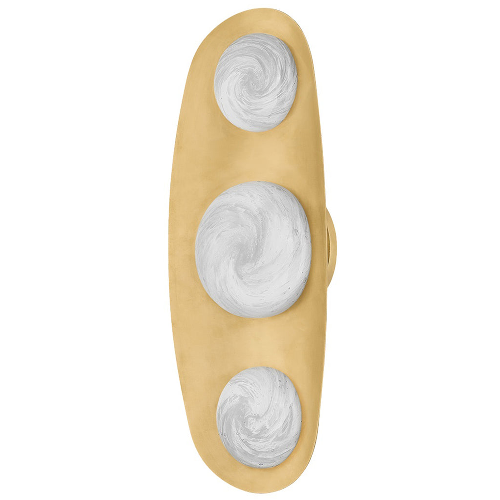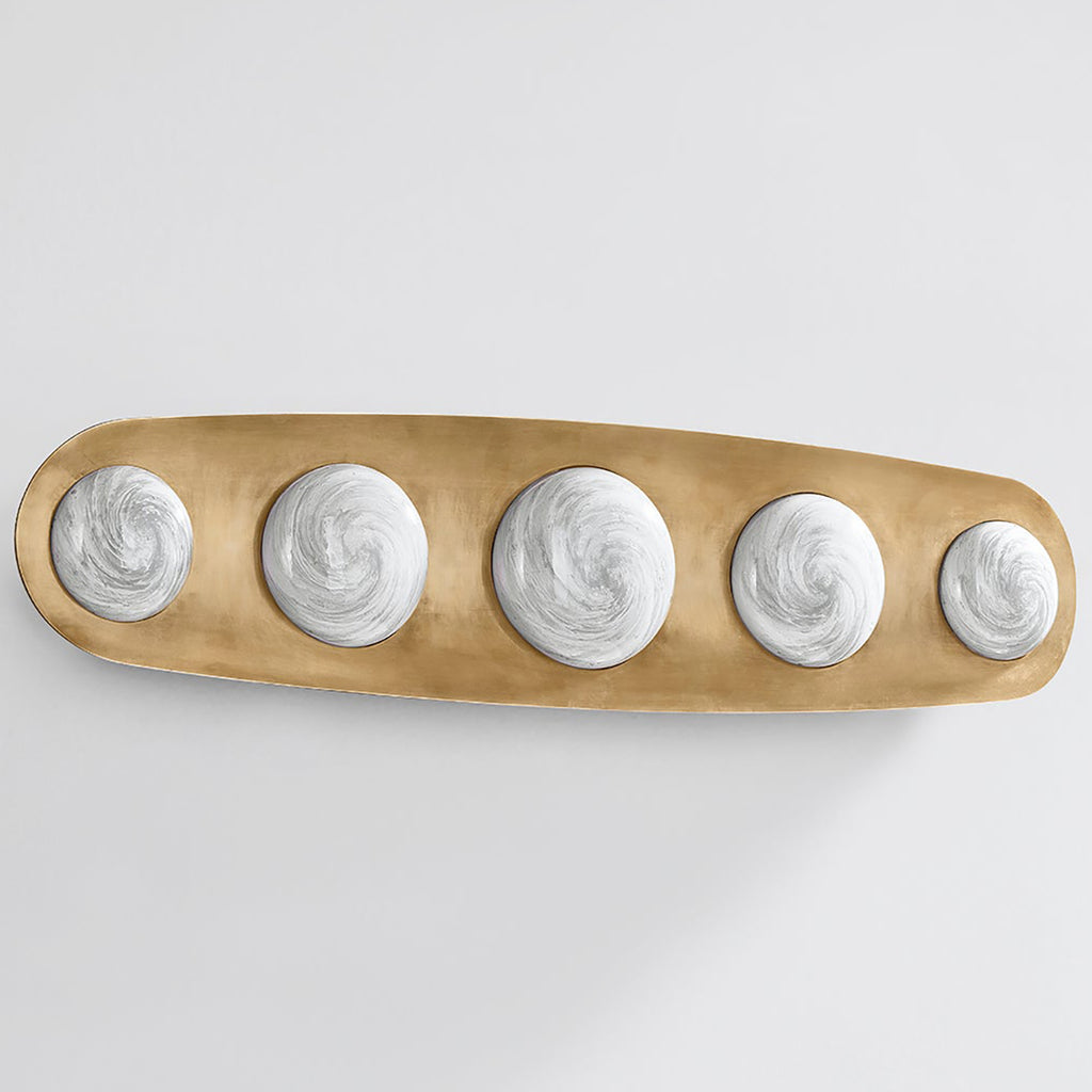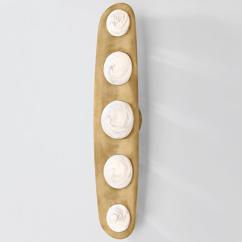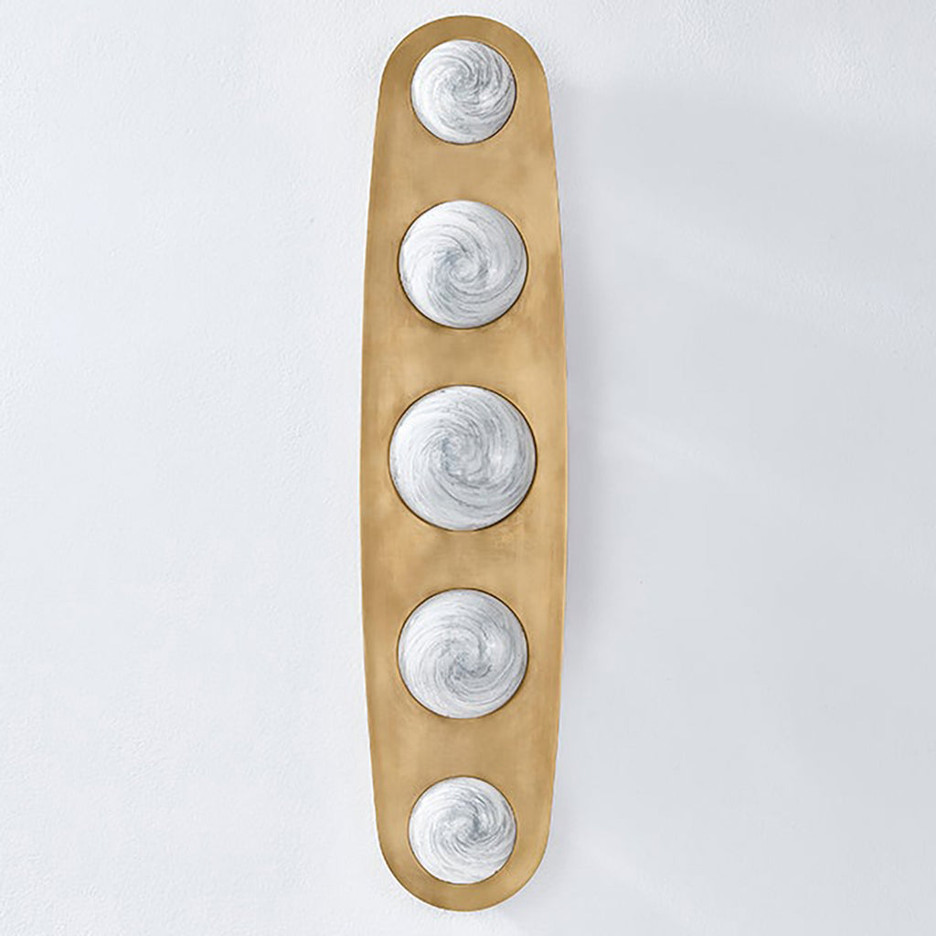 Originally inspired by ‘superflush’ jewelry settings, where a stone is set into densely cast metalwork, Corbett Lighting Bezel is bold and glamorous with a sleek, decorative design. The Luna glass shades, etched on the inside, allow the LED light to radiate through, creating an enchanting glow. A Vintage Brass finish adds an extra layer of elegance to this captivating fixture. Bezel is available as a 3 or 5-light sconce. Part of our Noz Nozawa collection.