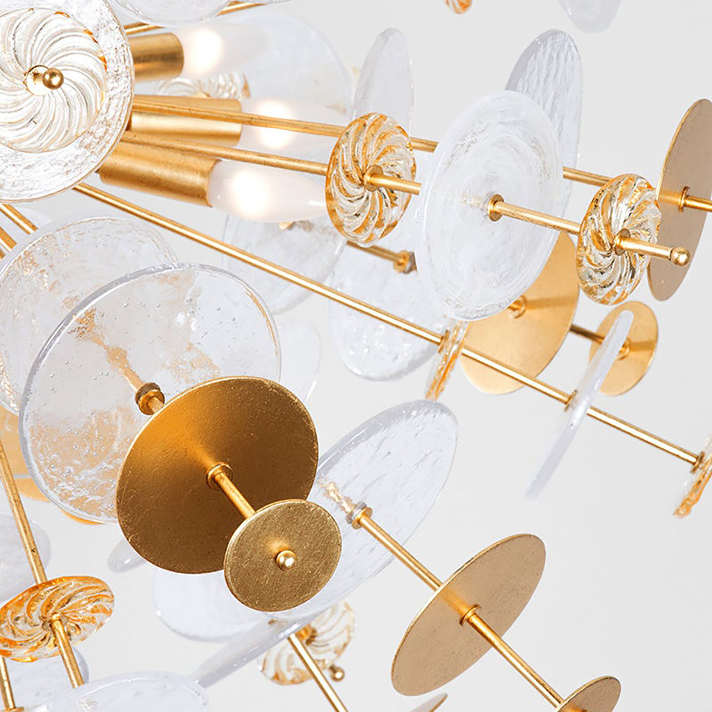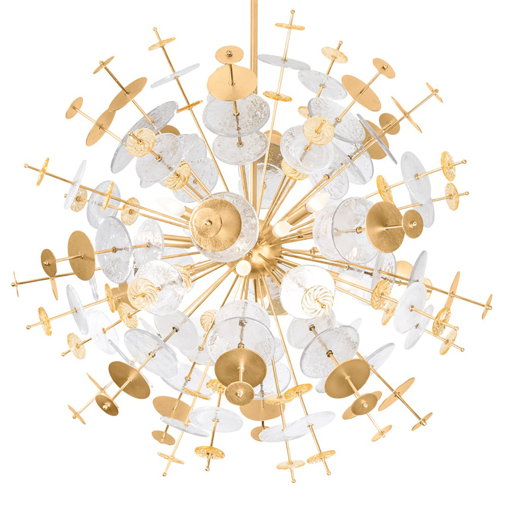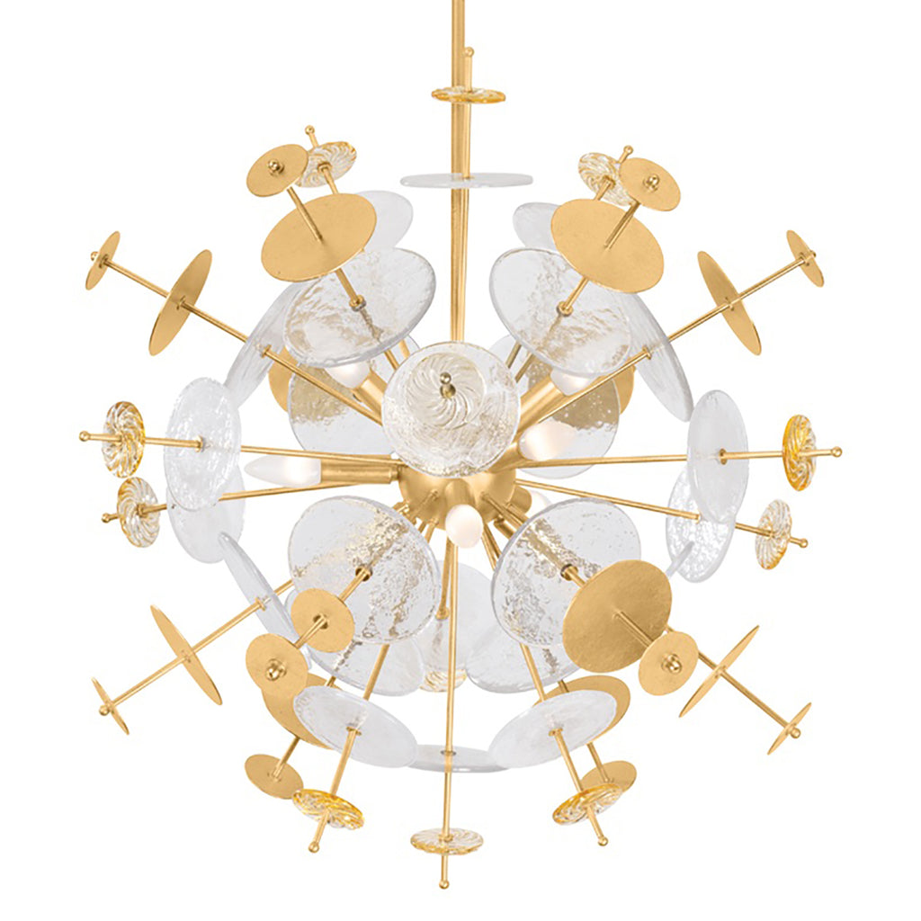 More than a chandelier, Corbett Lighting Gleason Chandelier is a contemporary work of art. With a futuristic Sputnik design, it features a burst of Vintage Gold Leaf spokes adorned with decorative cast glass and gold discs. The interplay between reflection, refraction, and transparency creates a compelling display of light. Available in two sizes, it provides a compelling statement piece.