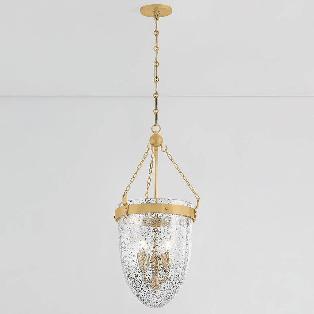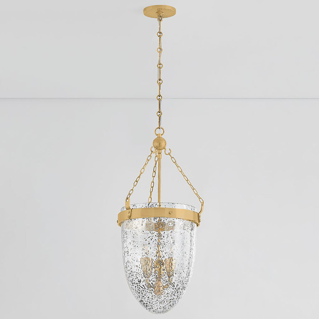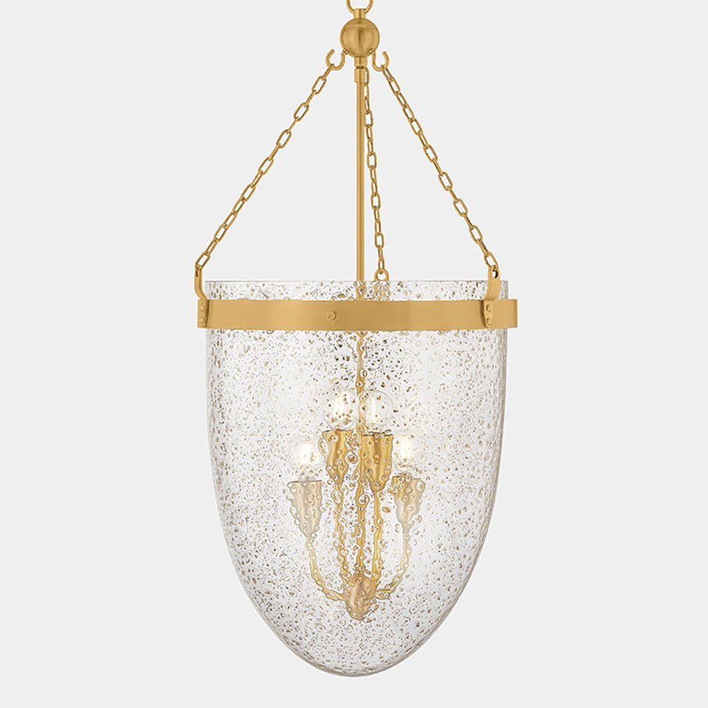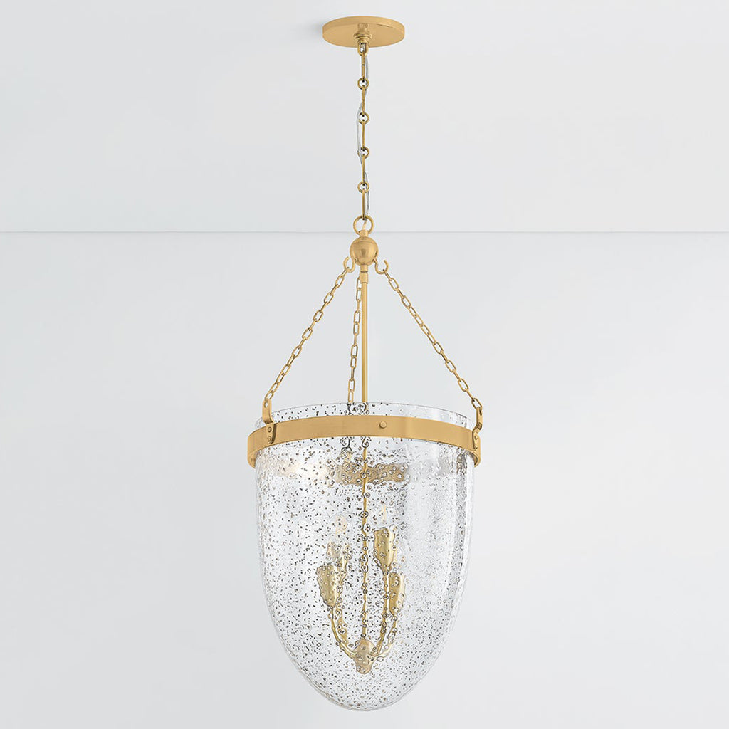 The clean lines, delicate chains, and statement drop shade of Corbett Lighting Angus offer a contemporary take on a lantern silhouette. The Mica glass shade is characterized by unique bubbles that give the surface a watery appearance. A Vintage Brass band with nodules anchors the fixture with an antique look. Available with 3 or 4 lights.