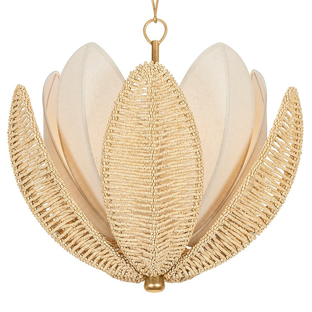 A celebration of nature, Corbett Lighting Costa Brava is the perfect blend of tropical texture and tonality. The outer shade of ‘petals’ is strung with coco shell beads, while the inner layer is woven from grained natural linen. Each petal features a center rib, creating a graceful curve to the shade. The Vintage Gold Leaf finial and canopy add a luxurious note. Available in two sizes, Costa Brava is an organic delight for any space.