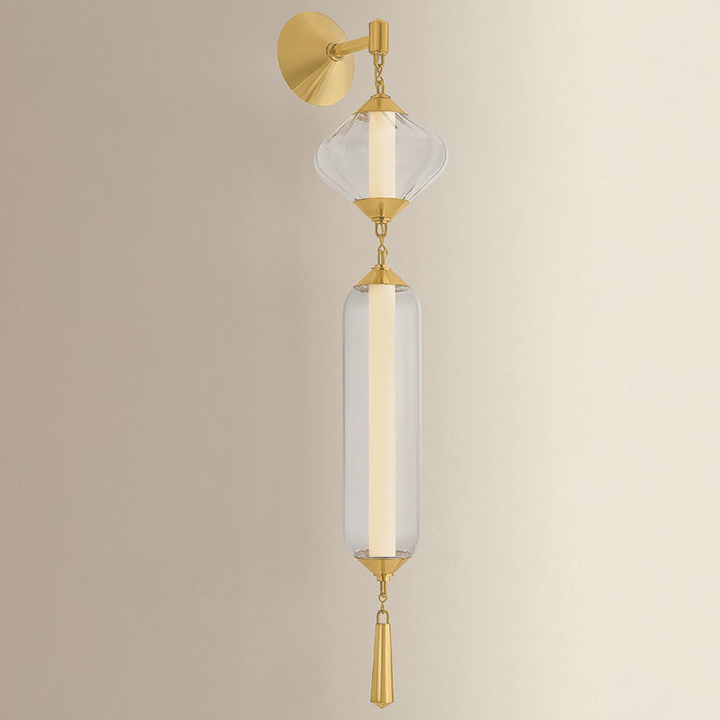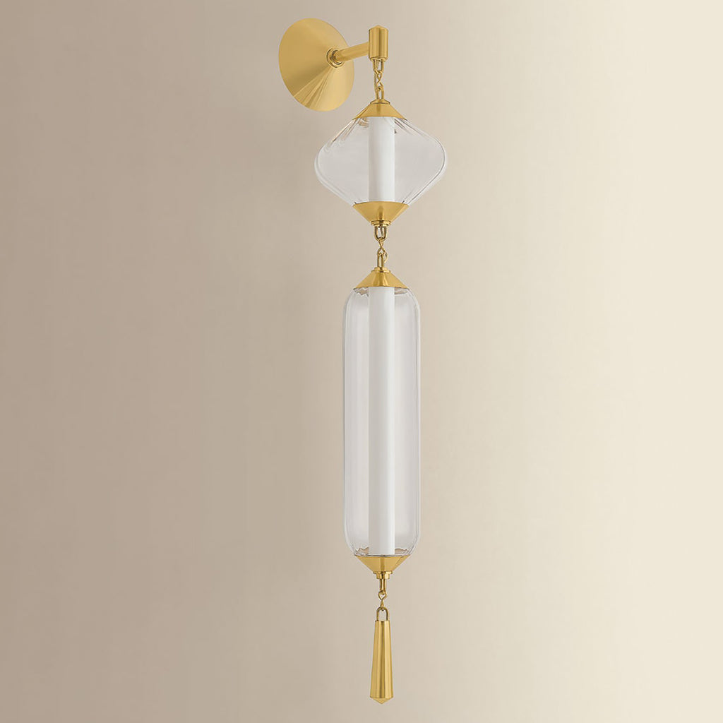 Corbett Lighting Fiorello’s gracious proportions magnify its impact. Combining geometric shapes, clear ribbed glass, and stylish metal counterweights, this installation-style piece is like jewelry for the home. The Vintage Patina Brass finish on the metalwork enriches the retro shapes, while the LED tubes feel fresh and contemporary. Fiorello is available as a 2-light sconce, a 3-light pendant, and a grand 9-light chandelier that stretches almost from floor to ceiling.