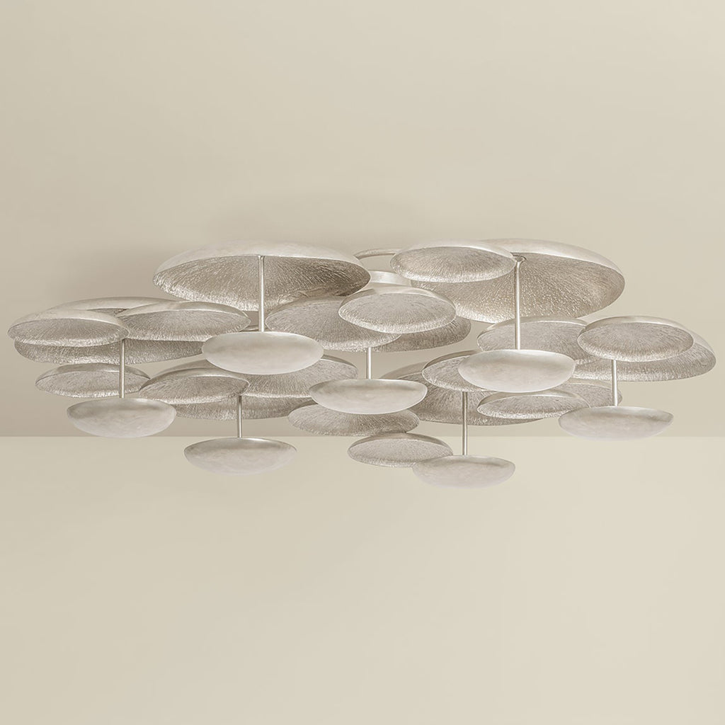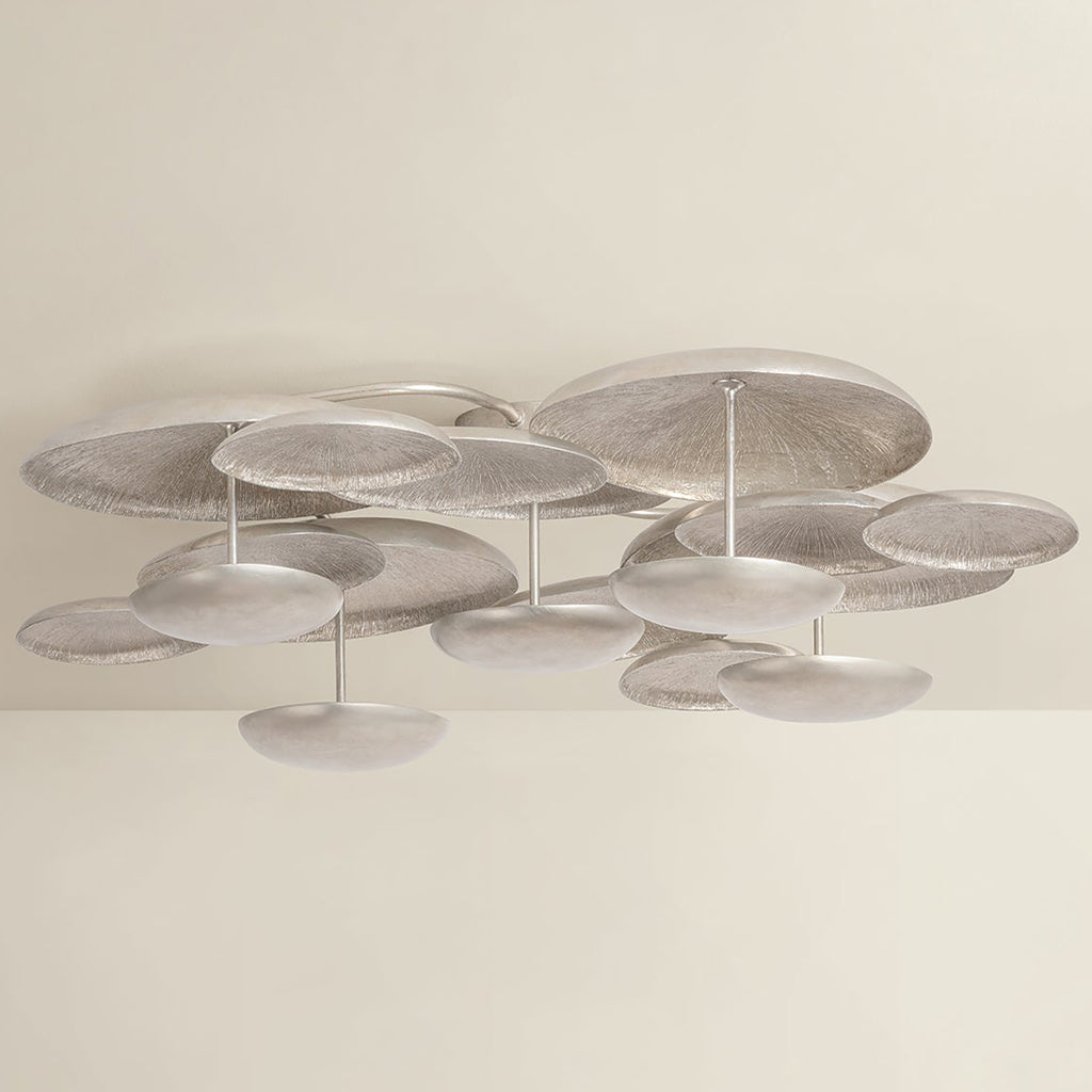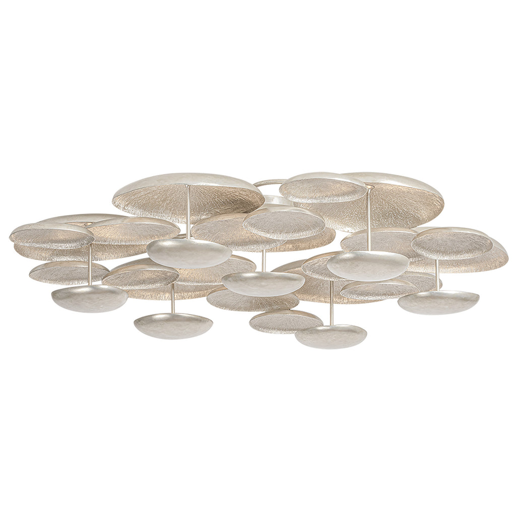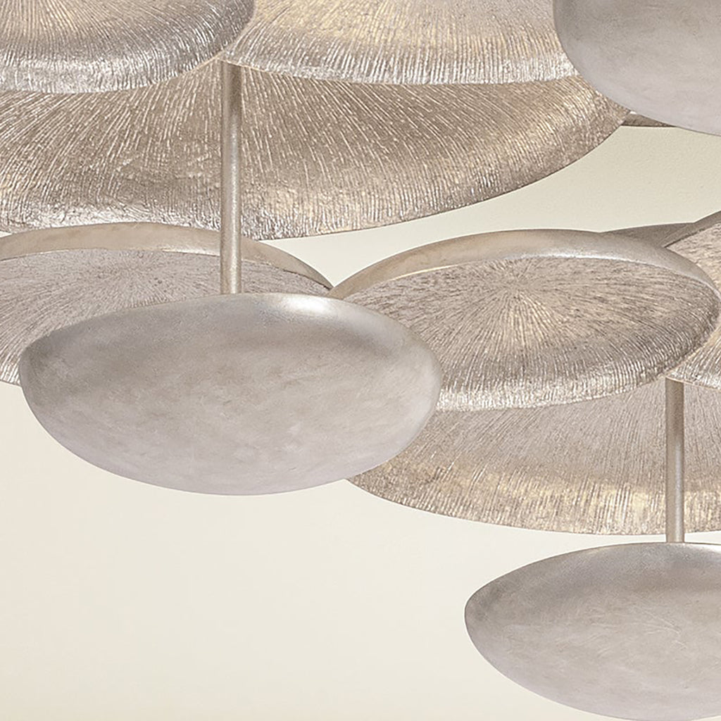 A close-to-ceiling fixture, the Corbett Lighting Fistral semi flush mount celebrates smooth, flowing shapes through its balanced, sculptural composition. Rounded metal discs are organized in an organic formation, creating a multi-dimensional layered effect. Finished in textured Warm Silver Leaf, the discs catch and reflect light from the integrated LED to produce an ambient glow. This stunning statement piece is available in two sizes.
