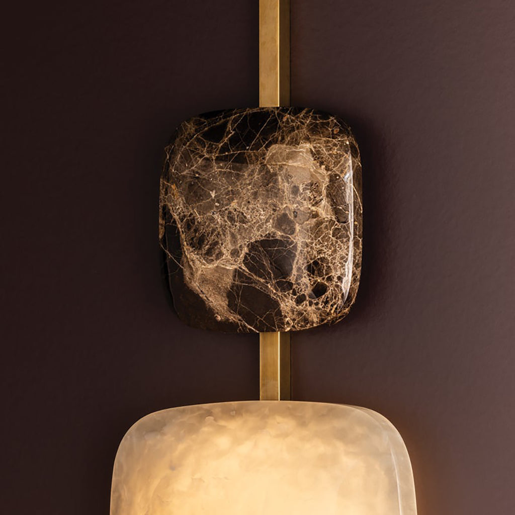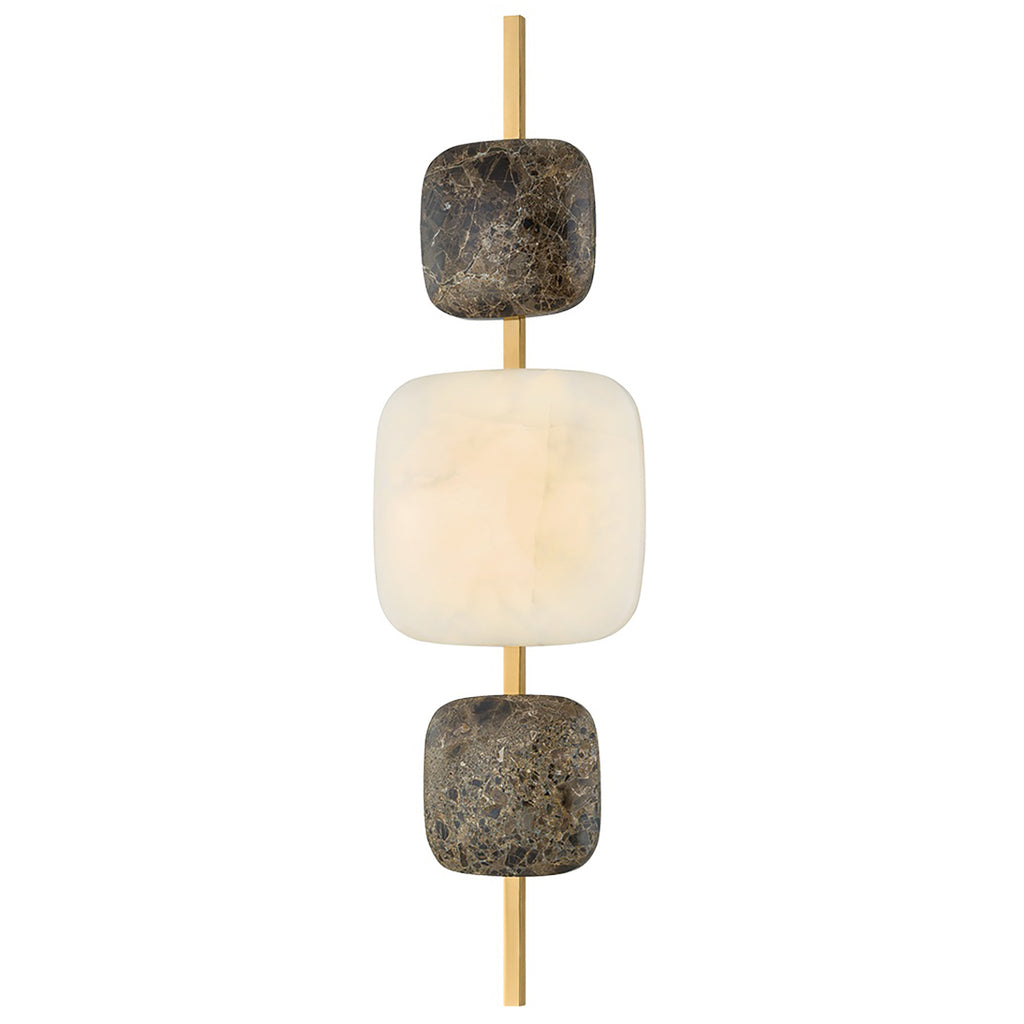 The Corbett Lighting Salisbury sconce elevates a simple composition with luxurious stone. Two Emperador marble pieces frame a central onyx shade, creating an earthy, gem-like stack. A thin stem finished in Vintage Brass supports the fixture like a gallery rod. Providing a soft diffusion of light, Salisbury is an artful focal point.
