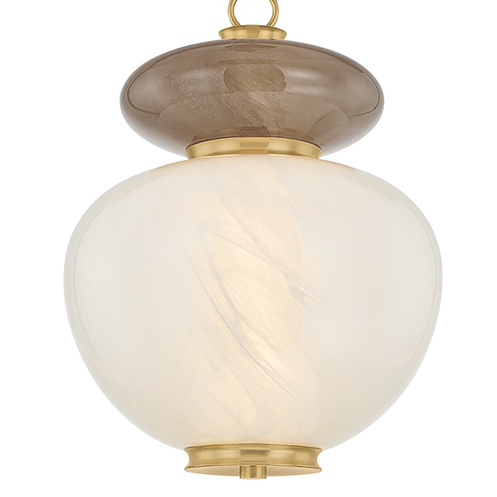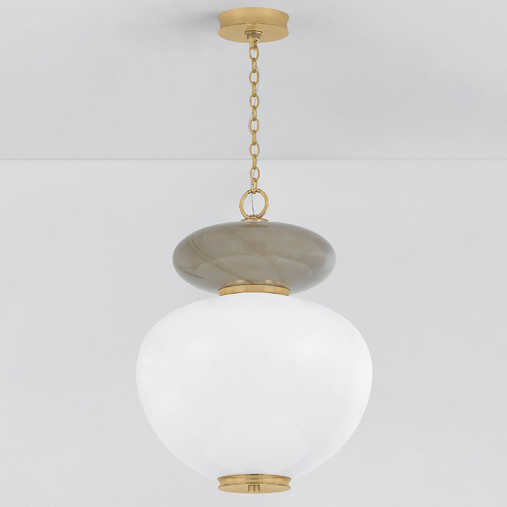 The organically-shaped Corbett Lighting Syros pendant is designed to be symmetric enough for use in multiples, while still feeling ornamental and elevated. It features a large Remolino Blanco glass shade topped by a smaller affogato glass shade. The sculptural stacked design is brought to life by the sense of movement in the specialty glass, accented by polished Vintage Brass metalwork. Available in two sizes.