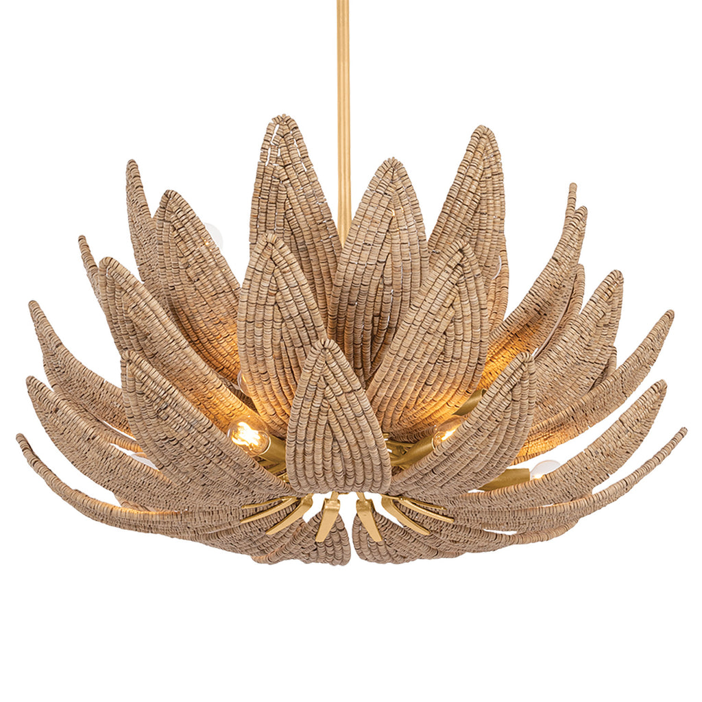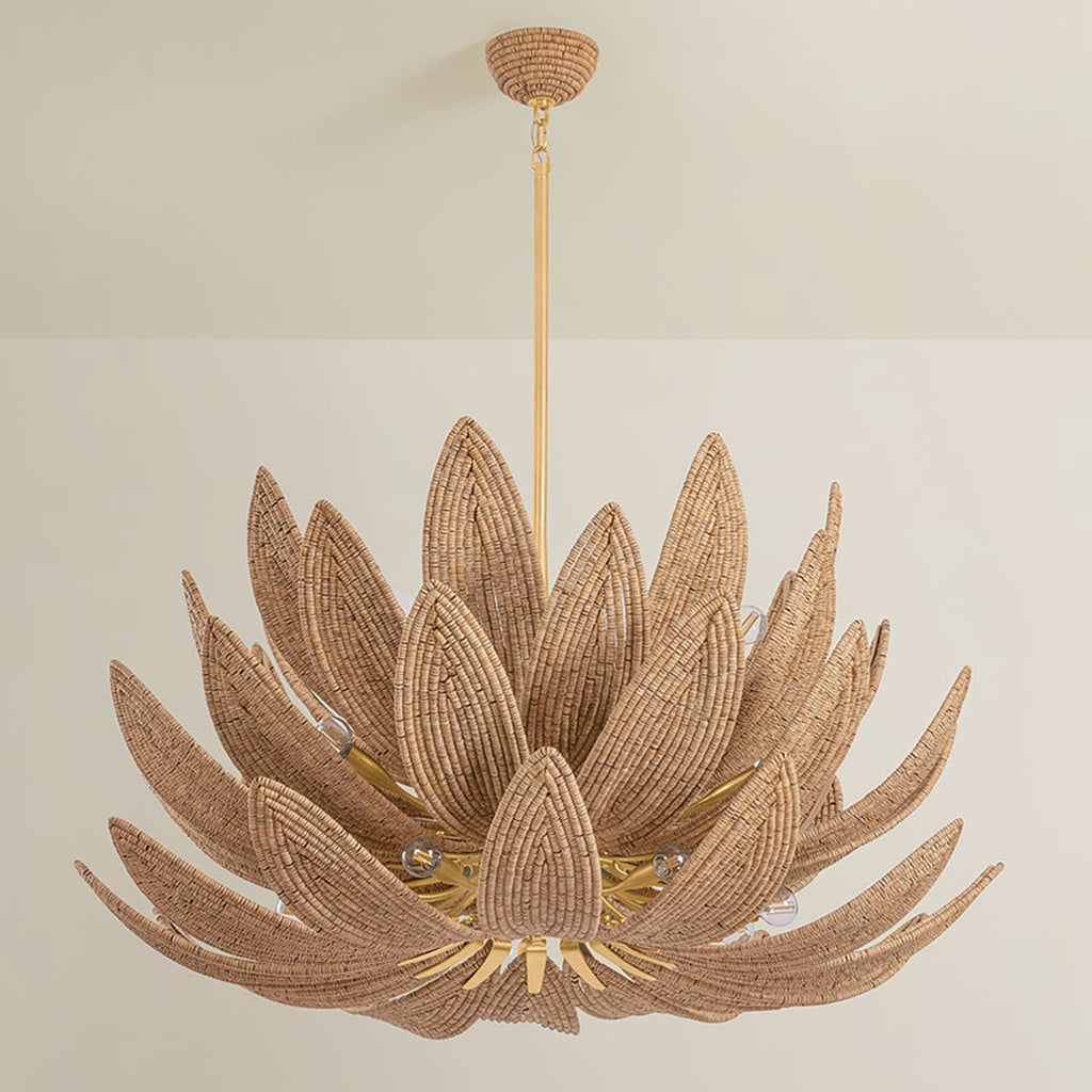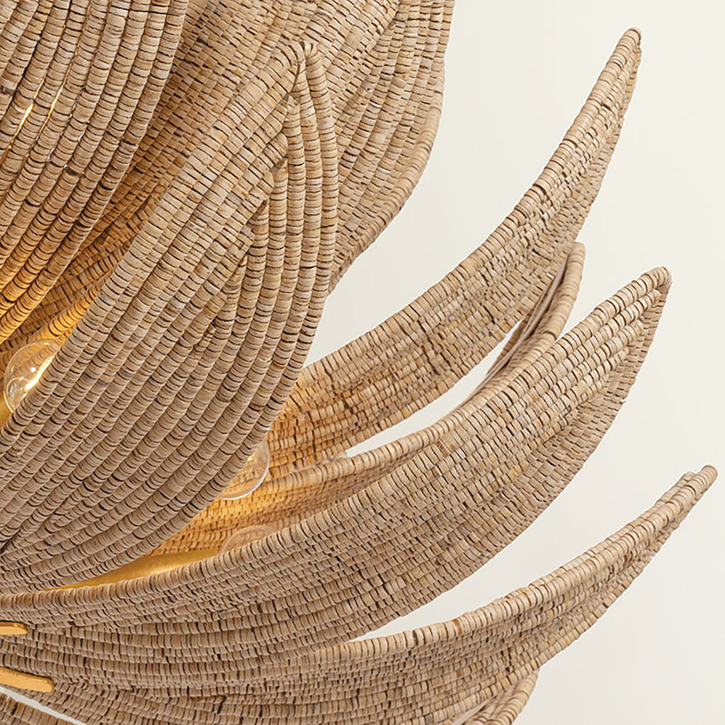 The Corbett Lighting Varanasi family takes the iconic artichoke light silhouette and remakes it with natural materials. Cascading tiers of ‘leaves’ curl inward, with each one made of hand-applied coco beads. A straight stem in Vintage Gold Leaf accompanies the neutral tones, while the beaded ceiling canopy creates a sense of cohesion. Available as a 1-light wall sconce or a chandelier with 14 or 28 lights.