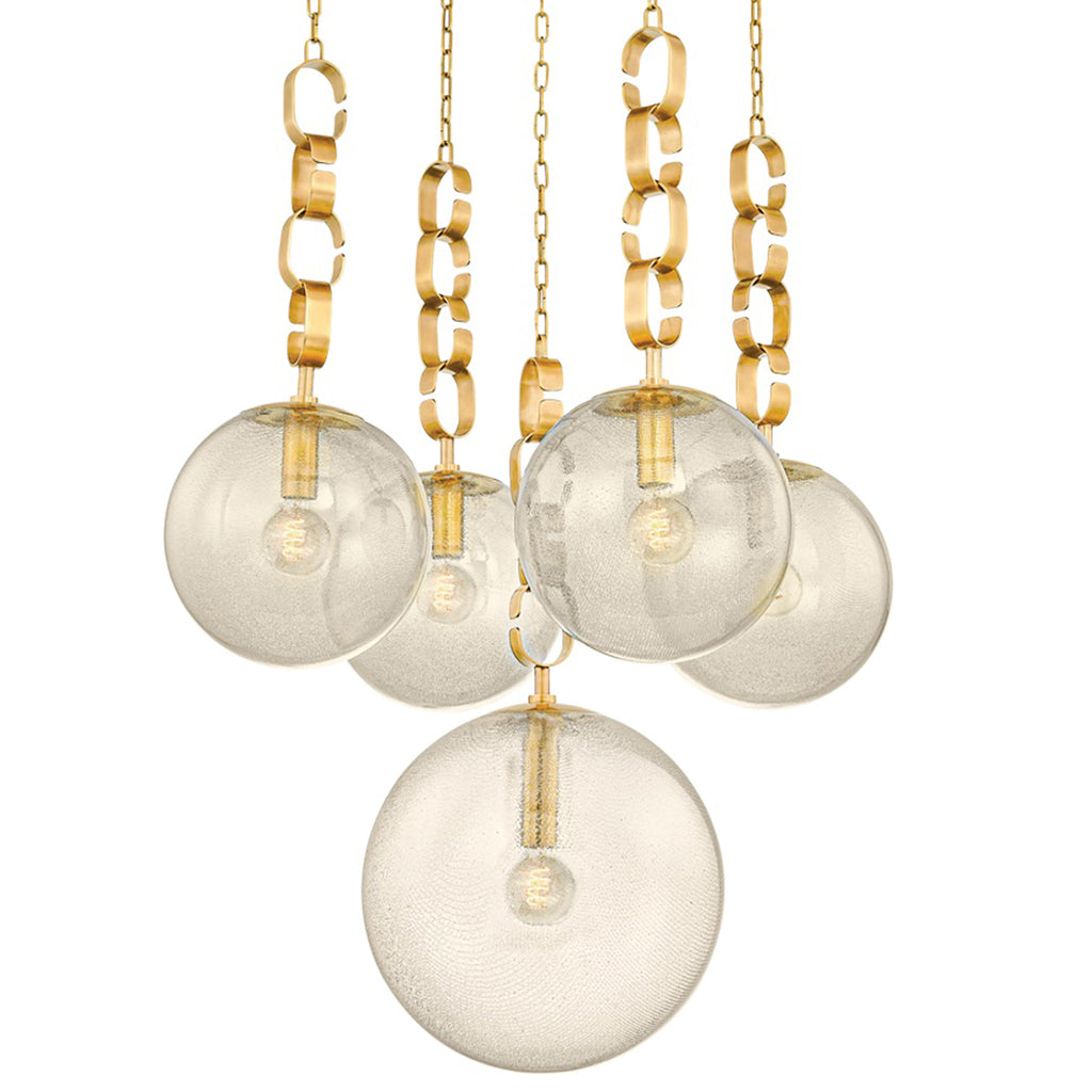 Drawing inspiration from the opulence of the 1930s, this fixture is comprised of seeded glass orbs suspended by chunky Vintage Brass chains. The uniquely colored and swirled glass, coupled with the vintage-inspired forms creates a stunning fixture with high decorative flair. Corbett Lighting Nessa glimmers with warmth, whether as a chandelier or a pendant light in two sizes.