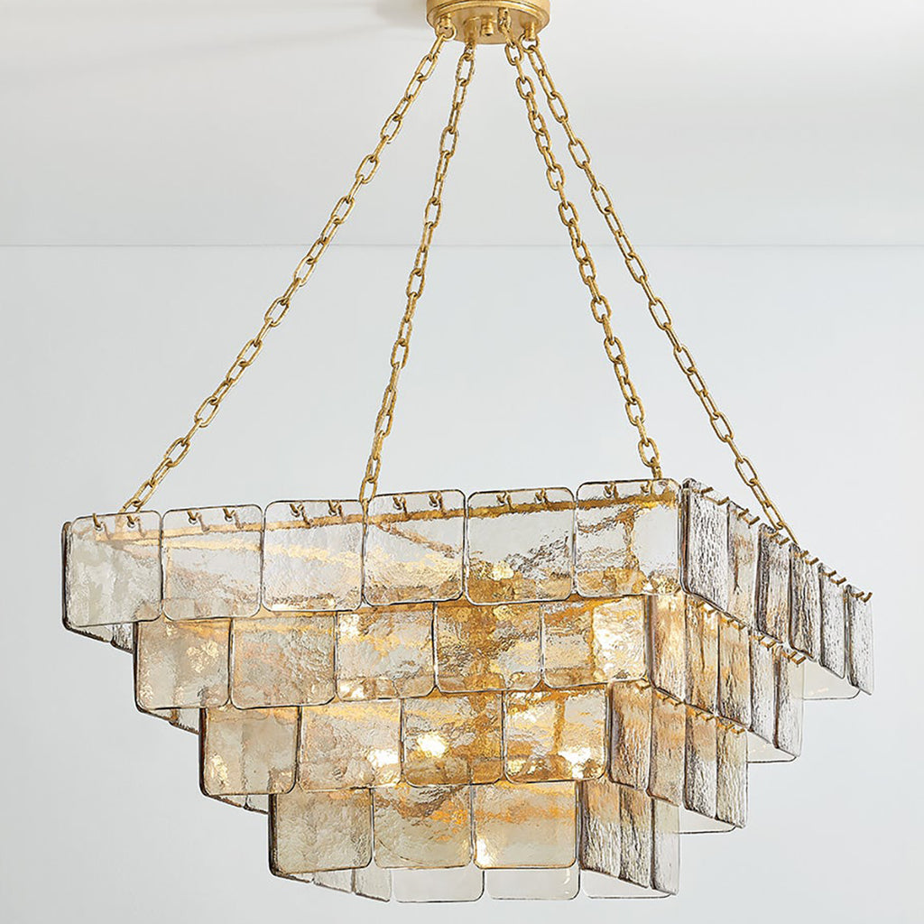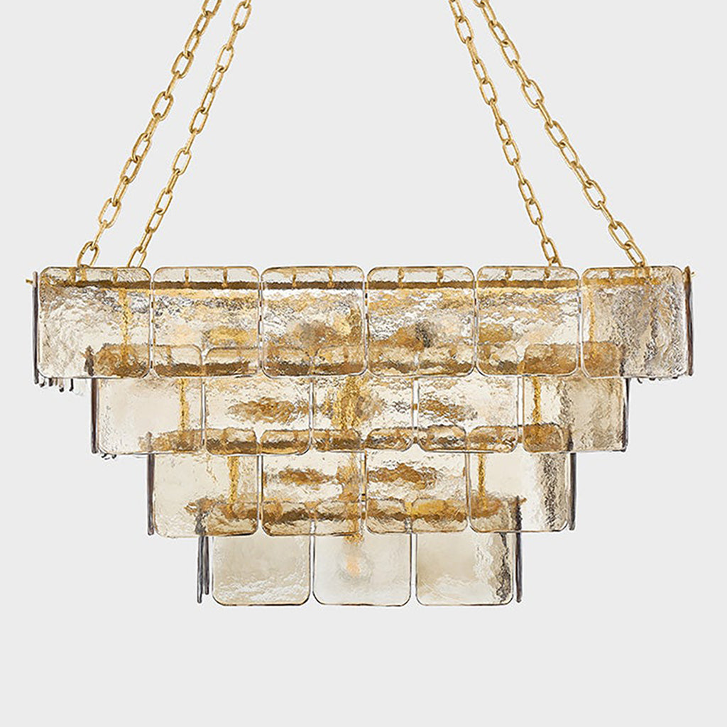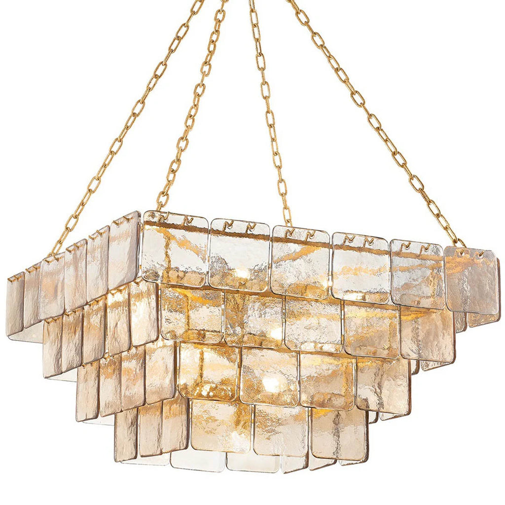 Three tiers of dark champagne piastre glass panels glisten with icy radiance in this striking chandelier. The shimmering surface, textural depth, and smoky hue of the glass combine to create a truly enchanting visual display overhead. Corbett Regal Chandelier is available as a 9 or 17-light chandelier with a Vintage Gold Leaf finish.