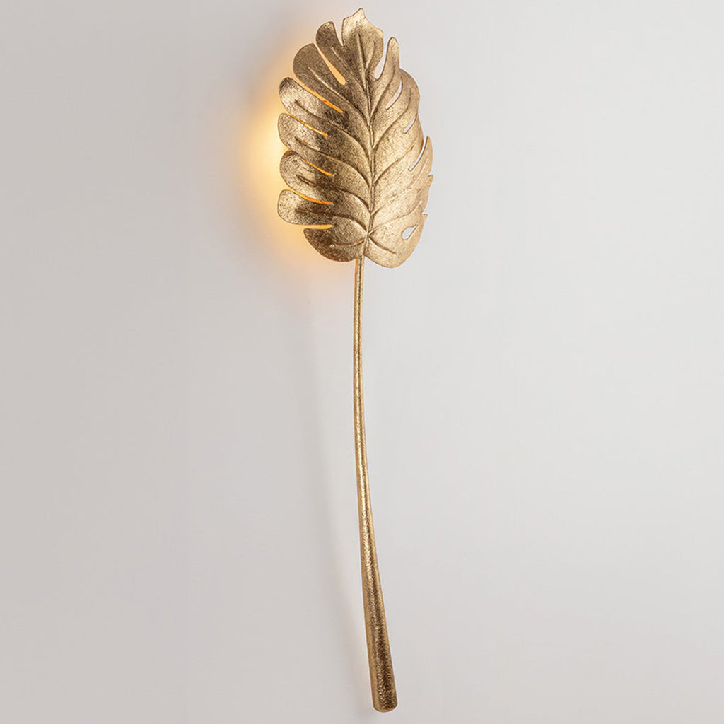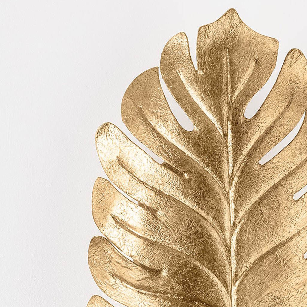 Taking the shape of a tropical leaf, Corbett Lighting Seychelles hangs as a work of art even without illumination. This ambient wall light features a long, slender stem and intricate veining. Available in luxurious Vintage Gold Leaf or a crisp Gesso White finish for a more contemporary feel.